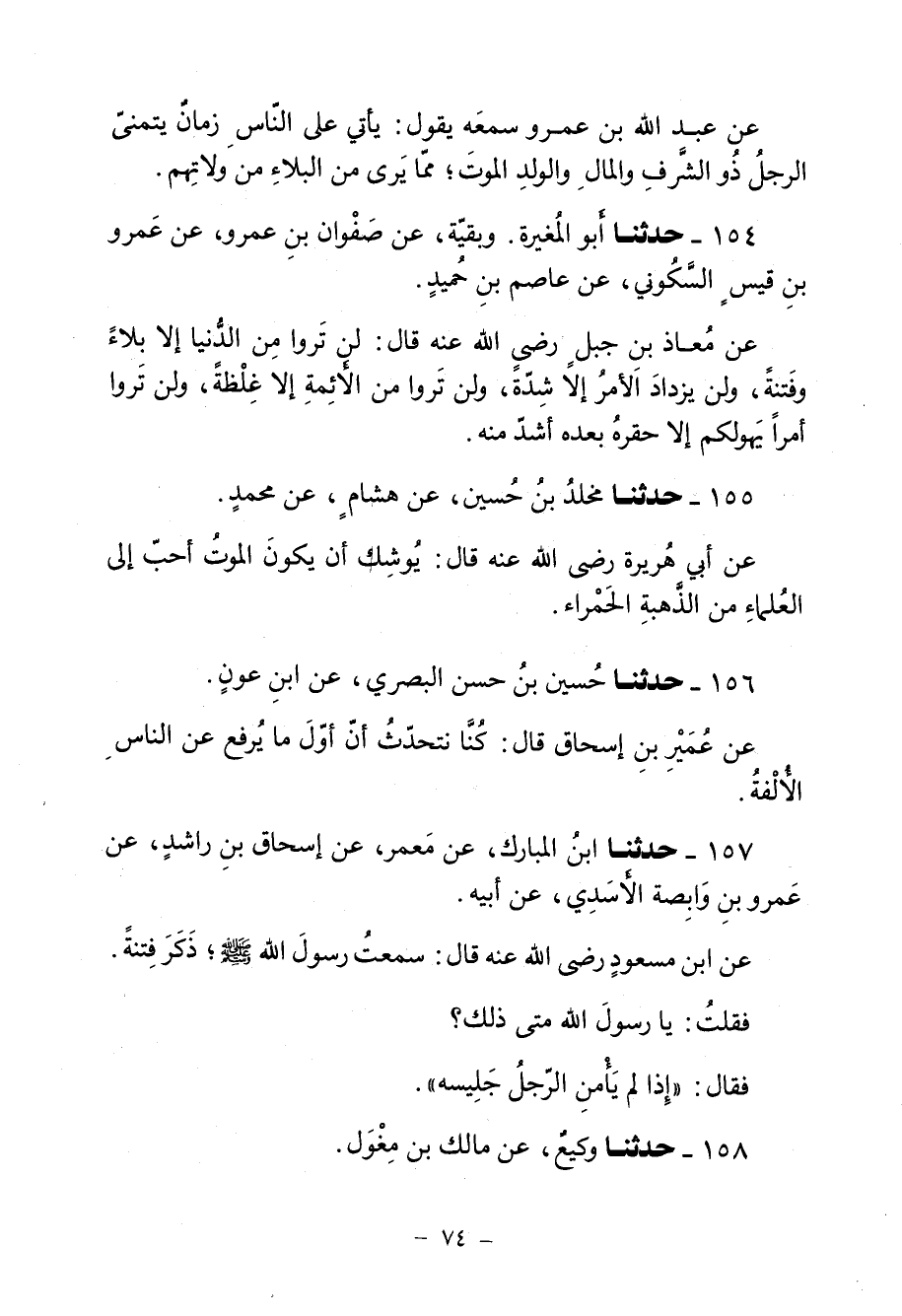 157 - حَدَّثَنَا ابْنُ مُبَارَكٍ، عَنْ مَعْمَرٍ، عَنْ إِسْحَاقَ بْنِ رَاشِدٍ، عَنْ عَمْرِو بْنِ وَابِصَةَ الْأَسَدِيِّ، عَنْ أَبِيهِ، عَنِ ابْنِ مَسْعُودٍ، رَضِيَ اللَّهُ عَنْهُ قَالَ: سَمِعْتُ رَسُولَ اللَّهِ صَلَّى اللهُ عَلَيْهِ وَسَلَّمَ ذَكَرَ فِتْنَةً، فَقُلْتُ: يَا رَسُولَ اللَّهِ، مَتَى ذَلِكَ؟ فَقَالَ: «§إِذَا لَمْ يَأْمَنِ الرَّجُلُ جَلِيسَهُ»