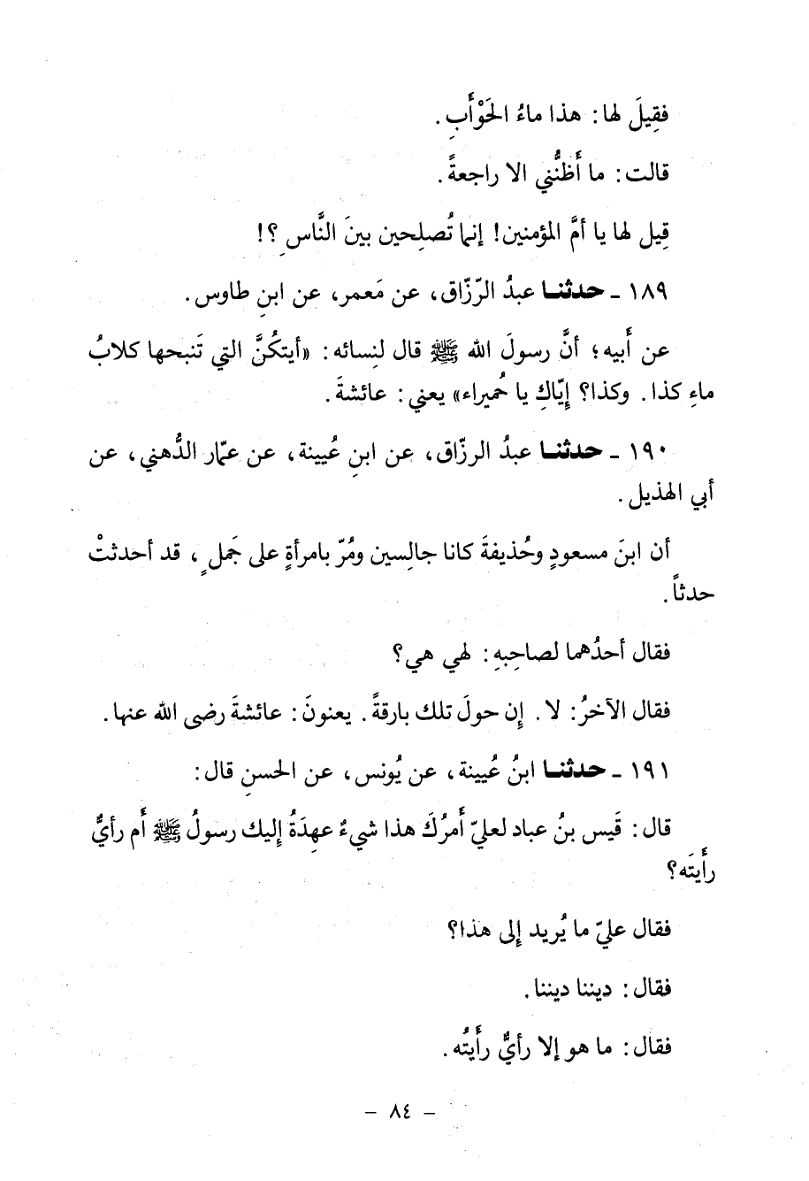 189 - حَدَّثَنَا عَبْدُ الرَّزَّاقِ، عَنْ مَعْمَرٍ، عَنِ ابْنِ طَاوُسٍ، عَنْ أَبِيهِ، أَنَّ رَسُولَ اللَّهِ صَلَّى اللهُ عَلَيْهِ وَسَلَّمَ قَالَ لِنِسَائِهِ: «§أَيَّتُكُنَّ الَّتِي تَنْبَحُهَا كِلَابُ مَاءِ كَذَا وَكَذَا، إِيَّاكِ يَا حُمَيْرَاءُ» يَعْنِي عَائِشَةَ