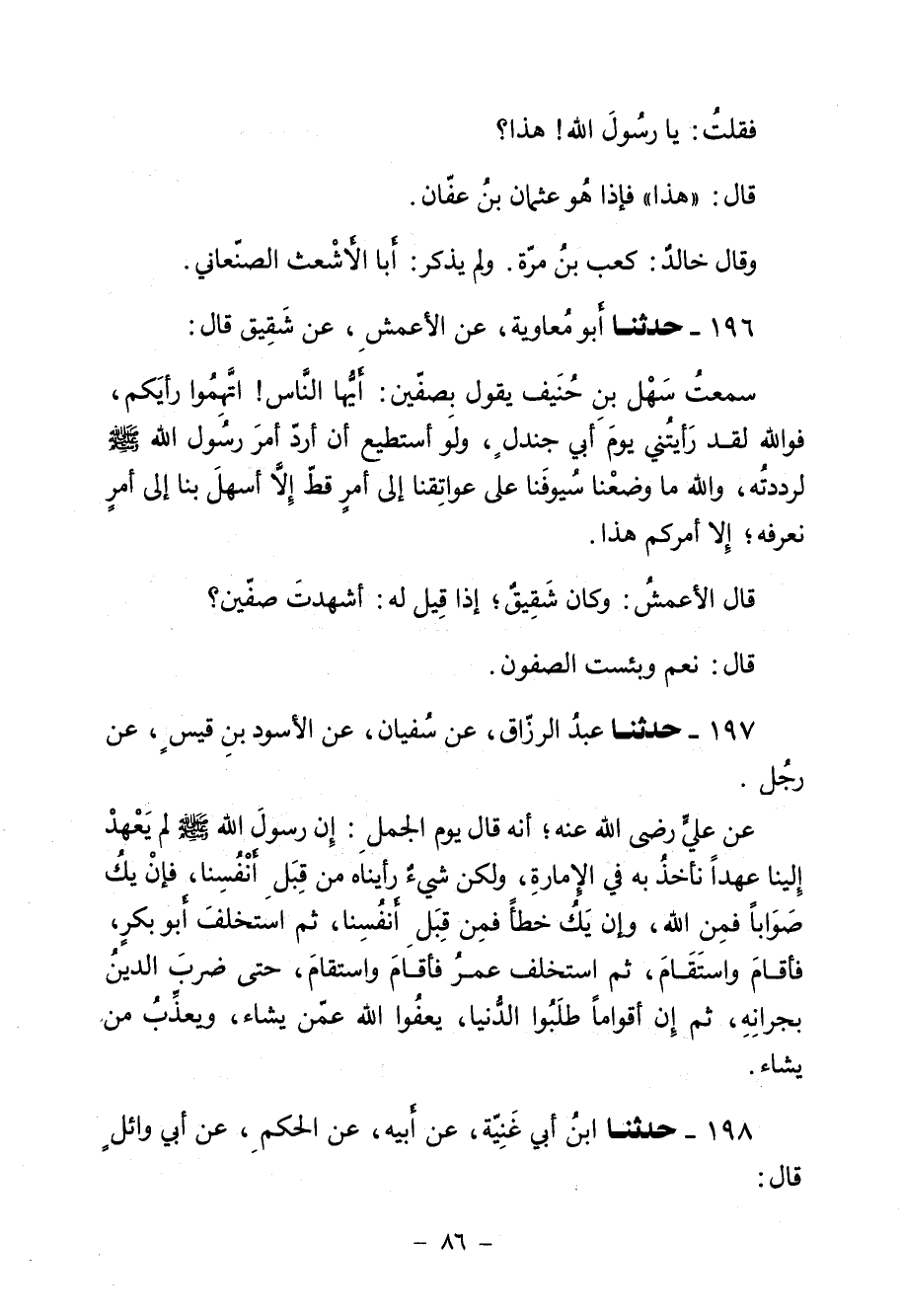 196 - حَدَّثَنَا أَبُو مُعَاوِيَةَ، عَنِ الْأَعْمَشِ، عَنْ شَقِيقٍ، قَالَ: سَمِعْتُ سَهْلَ بْنَ حُنَيْفٍ، يَقُولُ بِصِفِّينَ: «أَيُّهَا النَّاسُ، §اتَّهِمُوا رَأْيَكُمْ، فَوَاللَّهِ لَقَدْ رَأَيْتُنِي يَوْمَ أَبِي جَنْدَلٍ َلَوْ أَسْتَطِيعُ أَنْ أَرُدَّ أَمْرَ رَسُولِ اللَّهِ صَلَّى اللهُ عَلَيْهِ وَسَلَّمَ لَرَدَدْتُهُ، وَاللَّهِ مَا وَضَعْنَا سُيُوفَنَا عَلَى عَوَاتِقَنَا إِلَى أَمْرٍ قَطُّ إِلَّا أَسْهَلَ بِنَا إِلَى أَمْرٍ نَعْرِفُهُ إِلَّا أَمْرَكُمْ هَذَا» قَالَ الْأَعْمَشُ: وَكَانَ شَقِيقٌ إِذَا قِيلَ لَهُ: أَشَهِدْتَ صِفِّينَ؟ قَالَ: نَعَمْ، وَبِئْسَتِ الصُّفُونُ