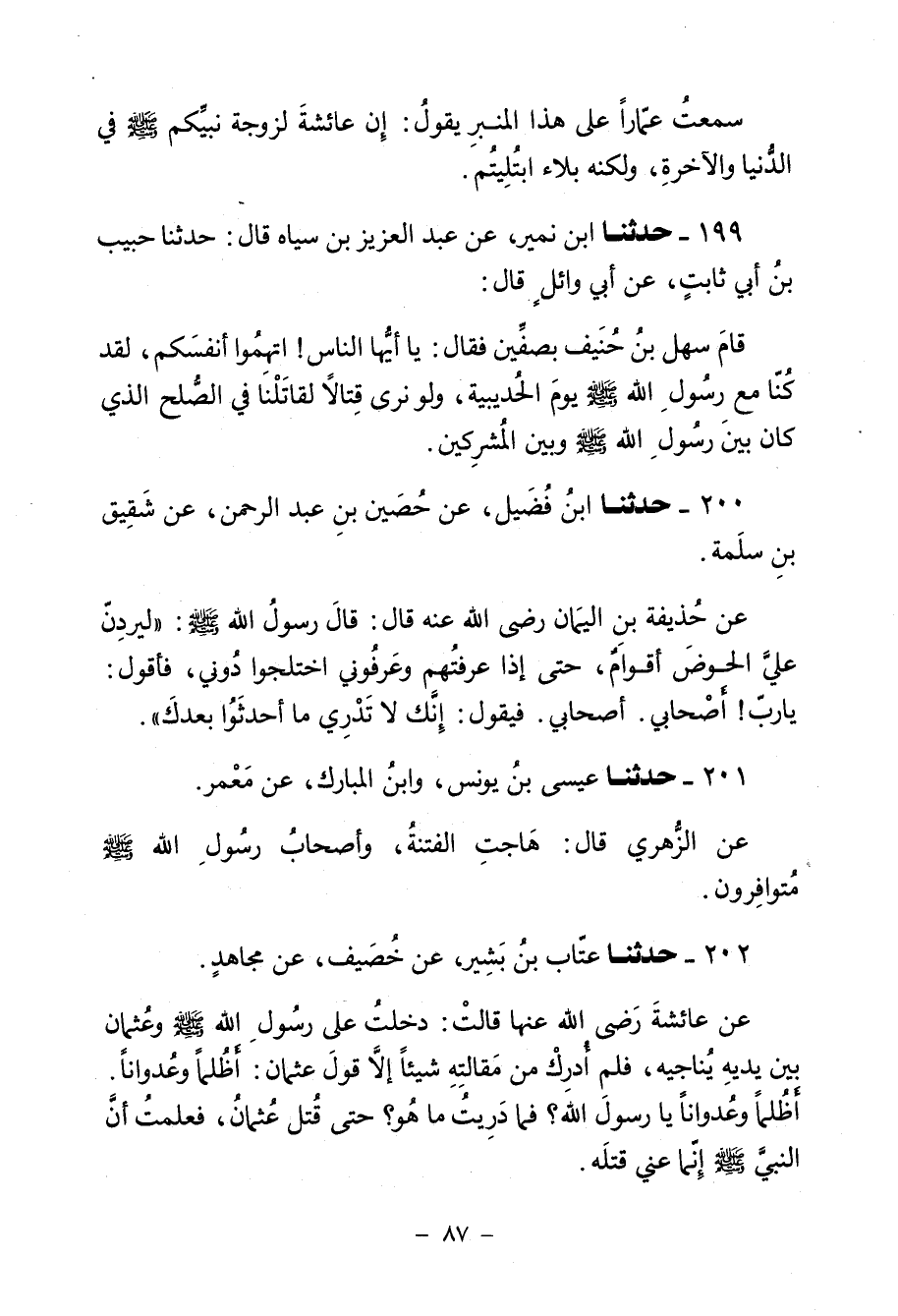 199 - حَدَّثَنَا ابْنُ نُمَيْرٍ، عَنْ عَبْدِ الْعَزِيزِ بْنِ سِيَاهْ، قَالَ: حَدَّثَنَا حَبِيبُ بْنُ أَبِي ثَابِتٍ، عَنْ أَبِي وَائِلٍ، قَالَ: قَامَ سَهْلُ بْنُ حُنَيْفٍ بِصِفِّينَ فَقَالَ: «يَا أَيُّهَا النَّاسُ §اتَّهِمُوا أَنْفُسَكُمْ، لَقَدْ كُنَّا مَعَ رَسُولِ اللَّهِ صَلَّى اللهُ عَلَيْهِ وَسَلَّمَ يَوْمَ الْحُدَيْبِيَةِ َلَوْ نَرَى قِتَالًا لَقَاتَلْنَا فِي الصُّلْحِ الَّذِي كَانَ بَيْنَ رَسُولِ اللَّهِ صَلَّى اللهُ عَلَيْهِ وَسَلَّمَ وَبَيْنَ الْمُشْرِكِينَ»