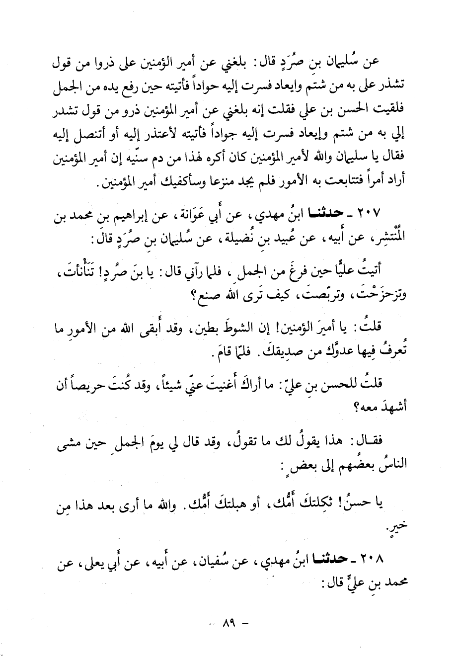 207 - حَدَّثَنَا ابْنُ مَهْدِيٍّ، عَنْ أَبِي عَوَانَةَ، عَنْ إِبْرَاهِيمَ بْنِ مُحَمَّدِ بْنِ الْمُنْتَشِرِ، عَنْ أَبِيهِ، عَنْ عُبَيْدِ بْنِ نُضَيْلَةَ، عَنْ سُلَيْمَانَ بْنِ صُرَدَ، قَالَ: أَتَيْتُ عَلِيًّا حِينَ فَرَغَ مِنَ الْجَمَلِ فَلَمَّا رَآنِي قَالَ: " يَا ابْنَ صُرَدَ، §تَنَأْنَأْتَ وَتَزَحْزَحْتَ وَتَرَبَّصْتَ، كَيْفَ تَرَى اللَّهَ صَنَعَ؟ قُلْتُ: يَا أَمِيرَ الْمُؤْمِنِينَ، إِنَّ الشَّوْطَ بَطِينٌ، وَقَدْ أَبْقَى اللَّهُ مِنَ الْأُمُورِ مَا تَعْرِفُ فِيهَا عَدُوَّكَ مِنْ صَدِيقِكَ، فَلَمَّا قَامَ قُلْتُ لِلْحَسَنِ بْنِ عَلِيٍّ: مَا أَرَاكَ أَغْنَيْتَ عَنِّي شَيْئًا، وَقَدْ كُنْتُ حَرِيصًا أَنْ أَشْهَدَ مَعَهُ، فَقَالَ: هَذَا يَقُولُ لَكَ مَا تَقُولُ وَقَدْ قَالَ لِي يَوْمَ الْجَمَلِ حِينَ مَشَى النَّاسُ بَعْضُهُمْ إِلَى بَعْضٍ: يَا حَسَنُ، ثَكِلَتْكَ أُمُّكَ، أَوْ هَبَلَتْكَ أُمُّكَ، وَاللَّهِ مَا أَرَى بَعْدَ هَذَا مِنْ خَيْرٍ "