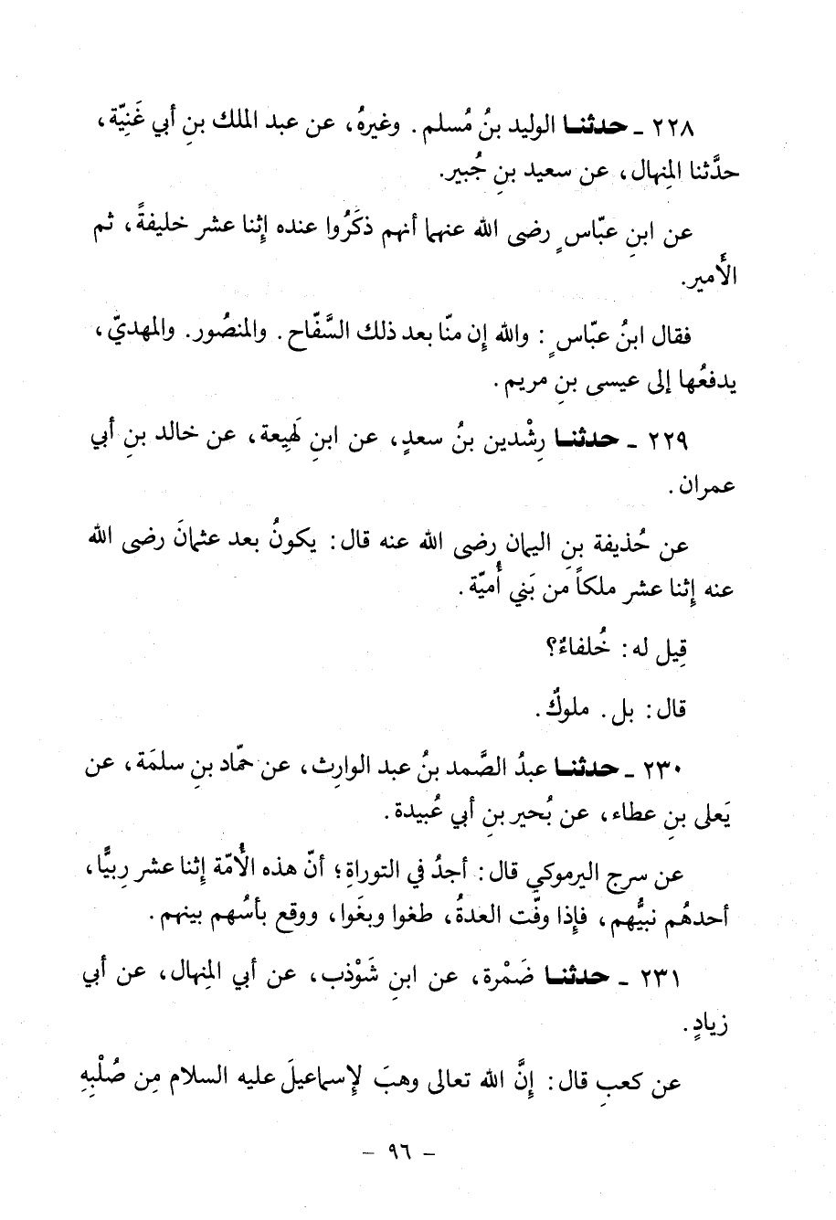 228 - حَدَّثَنَا الْوَلِيدُ بْنُ مُسْلِمٍ، وَغَيْرُهُ، عَنْ عَبْدِ الْمَلِكِ بْنِ أَبِي غَنِيَّةَ، ثَنَا الْمِنْهَالُ، عَنْ سَعِيدِ بْنِ جُبَيْرٍ، عَنِ ابْنِ عَبَّاسٍ، رَضِيَ اللَّهُ عَنْهُمَا أَنَّهُمْ ذَكَرُوا عِنْدَهُ اثْنَا عَشَرَ خَلِيفَةً، ثُمَّ الْأَمِيرَ، فَقَالَ ابْنُ عَبَّاسٍ: «وَاللَّهِ إِنَّ §مِنَّا بَعْدَ ذَلِكِ السَّفَّاحُ وَالْمَنْصُورُ وَالْمَهْدِيُّ، يَدْفَعُهَا إِلَى عِيسَى ابْنِ مَرْيَمَ»
