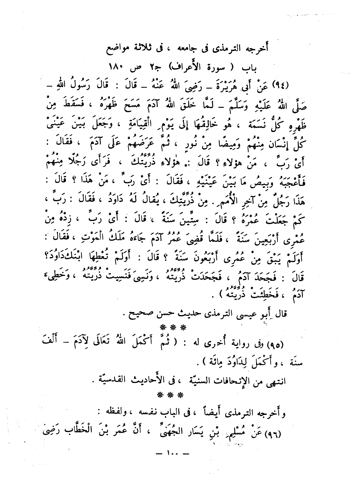 95 - عَنْ أَبي هُرَيْرَةَ - رَضِيَ اللَّهُ عَنْهُ - قَالَ: قالَ رَسُولُ اللَّهِ صلى الله عليه وسلّم: «لَمَّا خَلَقَ اللَّهُ آدَمَ مَسَحَ ظَهْرَهُ، فَسَقَطَ مِنْ ظَهْرِهِ كُلُّ نَسَمَة، هُو خَالِقُهَا إلَى يَوْمِ الْقِيَامَةِ، وَجَعَلَ بَيْنَ عَيْنَيْ كُلِّ إنْسَان مِنْهُمْ وَمِيضا مِنْ نُورٍ، ثُمَّ عَرَضَهُمْ عَلَى آدَمَ، فَقَالَ: أَيْ رَبِّ، مَنْ هؤلاءِ؟ قَالَ: هوُلاَءِ ذُرِّيَّتُكَ، فَرَأَى رَجُلاً مِنْهُمْ فَأَعْجَبَهُ وَبِيصُ مَا بَيْنَ عَيْنَيْهِ، فَقَالَ: أَيْ رَبِّ، مَنْ هَذَا؟ قَالَ: هَذَا رَجُلٌ مِنْ آخِرِ الأُمَمِ. مِنْ ذُرِّيَّتِكَ، يُقالُ لَهُ دَاوُدَ، فَقَالَ: رَبِّ، كَمْ جَعَلْتَ عُمْرَهُ؟ قَالَ: سِتِّينَ سَنَةً، قَالَ: أَيْ رَبِّ، زِدْهُ مِنْ عُمْرِي أَرْبَعِينَ سَنَةً، فَلَمَّا قُضِي عُمُرُ آدَمَ جَاءَهُ مَلَكُ الْمَوْتِ، فَقَالَ: أَوَلَمْ يَبْقَ مِنْ عُمُرِي أَرْبَعُونَ سَنَةً؟ قَالَ: أَوَلَمْ تُعْطِهَا ابْنَكَ دَاوُدَ؟ قَالَ: فَجَحَدَ آدَمُ، فَجَحَدَتْ ذُرِّيَّتُهُ، وَنَسِيَ فَنَسِيتْ ذُرِّيَّتُهُ، وَخَطِىءَ آدَمُ، فَخَطِئَتْ ذُرِّيَّتُهُ».