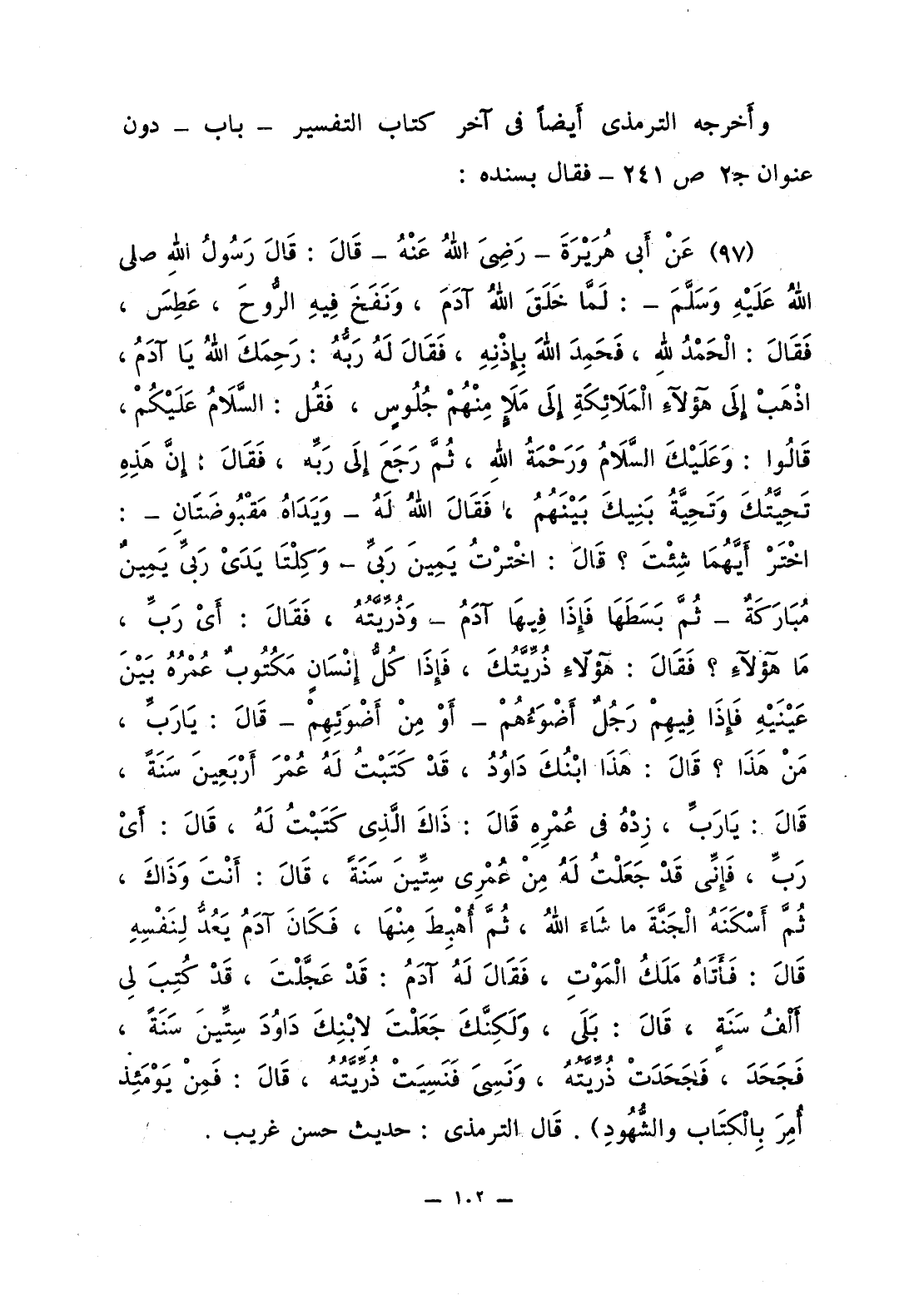 98 - عَنْ أَبي هُرَيْرَةَ - رَضِيَ اللَّهُ عَنْهُ - قَالَ: قَالَ رَسُولُ اللَّهِ صلى الله عليه وسلّم: «لَمَّا خَلَقَ اللَّهُ آدَمَ، وَنَفَخَ فِيهِ الرُّوحَ، عَطِسَ، فَقَالَ: الْحَمْدُ لِلَّهِ، فَحَمِدَ اللَّهَ بَإذْنِهِ، فَقَالَ لَهُ رَبُّهُ، رَحِمَكَ اللَّهُ يَا آدَمُ، اذْهَبْ إلَى هؤلاءِ الْمَلاَئِكةِ إلَى مَلإٍ مِنْهُمْ جُلُوسٍ، فَقُلْ: السَّلاَمُ عَلَيْكُمْ، قَالُوا: وَعَلَيْكَ السَّلاَمُ وَرَحْمَةُ اللَّهِ، ثُمَّ رَجَعَ إلَى رَبِّهِ، فَقَالَ: إنَّ هَذِهِ تَحِيَّتُكَ وَتَحِيَّةُ بَنِيكَ بَيْنَهُمُ، فَقَالَ اللَّهُ لَهُ - وَيَدَاهُ مَقْبُوضَتَانِ -: اخْتَرْ أَيَّهُمَا شِئْتَ؟ قَالَ: اخْتَرْتُ يَمِينَ رَبِّي - وَكِلْتَا يَدَيْ رَبِّي يَمِينٌ مُبَارَكَةٌ - ثُمَّ بَسَطَهَا فَإذَا فِيهَا آدَمُ - وَذُرِّيَّتُهُ، فَقَالَ: أَيْ رَبِّ، مَا هؤلاءِ؟ فَقَالَ: هؤلاءِ ذُرِّيَّتُكَ، فَإذَا كُلُّ إنْسَانٍ مَكْتُوبٌ عُمْرُهُ بَيْنَ عَيْنَيْه فَإذَا فِيهِمْ رَجُلٌ أَضْوَءُهُمْ - أَوْ مِنْ أَضْوَئِهِمْ - قَالَ: يَا رَبِّ، مَنْ هَذَا؟ قَالَ: هَذَا ابْنُكَ دَاوُدُ، قَدْ كَتَبْتُ لَهُ عُمْرَ أَرْبَعِينَ سَنَةً، قَالَ: يَا رَبِّ، زِدْهُ في عُمْرِهِ قَالَ: ذَاكَ الَّذِي كَتَبْتُ لَهُ، قَالَ: أَيْ رَبِّ، فَإنِّي قَدْ جَعَلْتُ لَهُ مِنْ عُمْرِي سِتِّينَ سَنَةً، قَالَ: أَنْتَ وَذَاكَ، ثُمَّ أَسْكَنَهُ الْجَنَّةَ مَا شَاءَ اللَّهُ، ثُمَّ أُهْبِطَ مِنْهَا، فَكَانَ آدَمُ يَعُدُّ لِنَفْسِهِ قَالَ: فَأَتَاهُ مَلَكُ الْمَوْتِ، فَقَالَ لَهُ آدَمُ: قَدْ عَجَّلْتَ، قَدْ كُتِبَ لي أَلْفَ سَنَةٍ، قَالَ: بَلَى، وَلَكِنَّكَ جَعَلْتَ لاِبْنِكَ دَاوُدَ سِتِّينَ سَنَةً، فَجَحَدَ، فَجَحَدَتْ ذُرِّيَّتُهُ، وَنَسِيَ فَنَسِيَتْ ذُرِّيَّتُهُ، قَالَ: فَمِنْ يَوْمَئِذٍ أُمِرَ بِالْكِتَابِ والشُّهُودِ». قال الترمذي: حديث حسن غريب.