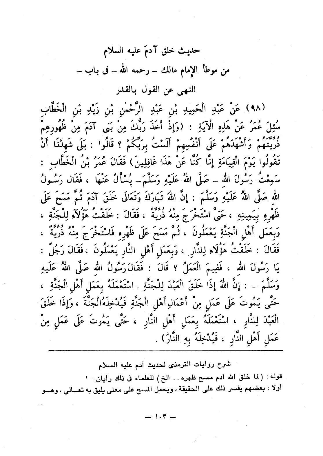 99 - عَنْ عَبْدِ الْحَمِيدِ بْنِ عَبْدِ الرَّحْمنِ بْنِ زَيْدِ بْنِ الْخَطَّابِ سُئِلَ عُمَرُ عَنْ هَذِهِ الآيَةِ: {وَإِذْ أَخَذَ رَبُّكَ مِن بَنِي آدَمَ مِن ظُهُورِهِمْ ذُرِّيَّتَهُمْ وَأَشْهَدَهُمْ عَلَى أَنفُسِهِمْ أَلَسْتُ بِرَبِّكُمْ قَالُواْ بَلَى شَهِدْنَآ أَن تَقُولُواْ يَوْمَ الْقِيَامَةِ إِنَّا كُنَّا عَنْ هَذَا غَافِلِينَ} فَقَالَ عُمَرُ بْنُ الْخَطَّابِ: سَمِعْتُ رَسُولَ اللَّهِ يُسْأَلُ عَنْهَا، فَقَال رَسُولُ اللَّهِ صلى الله عليه وسلّم: «إنَّ اللَّهَ تَبَارَكَ وَتَعَالَى خَلَقَ آدَمَ ثُمَّ مَسَحَ عَلَى ظَهْرِهِ بِيَمِينِهِ، حَتَّى اسْتَخْرَجَ مِنْهُ ذُرِّيَّةً، فَقَالَ: خَلَقْتُ هوَلاءِ لِلْجَنَّةِ، وَبِعَمَلِ أَهْلِ الْجَنَّةِ يَعْمَلُونَ، ثُمَّ مَسَحَ عَلَى ظَهْرِهِ فَاسْتَخْرَجَ مِنْهُ ذُرِّيَّةً، فَقَالَ: خَلَقْتُ هَوُلاَءِ لِلنَّارِ، وَبِعَمَلِ أَهْلِ النَّارِ يَعْمَلُونَ»، فَقَالَ رَجُلٌ: يَا رَسُولَ اللَّهِ، فَفِيم الْعَمَلُ؟ قَالَ: فَقَالَ رَسُولُ اللَّهِ صلى الله عليه وسلّم: «إنَّ اللَّهَ إذَا خَلَقَ الْعَبْدَ لِلْجَنَّةِ، اسْتَعْمَلَهُ بِعَمَلِ أَهْلِ الْجَنَّةِ، حَتَّى يَمُوتَ عَلَى عَمَلٍ مِنْ أَعْمَالِ أَهْلِ الْجَنَّةِ فَيُدْخِلَهُ الْجَنَّةَ، وَإذَا خَلَقَ الْعَبْدَ لِلنَّارِ، اسْتَعْمَلَهُ بِعَمَلِ أَهْلِ النَّارِ، حَتَّى يَمُوتَ عَلَى عَمَلٍ مِنْ عَمَلِ أَهْلِ النَّارِ، فَيُدْخِلَهُ بِهِ النَّارَ».
