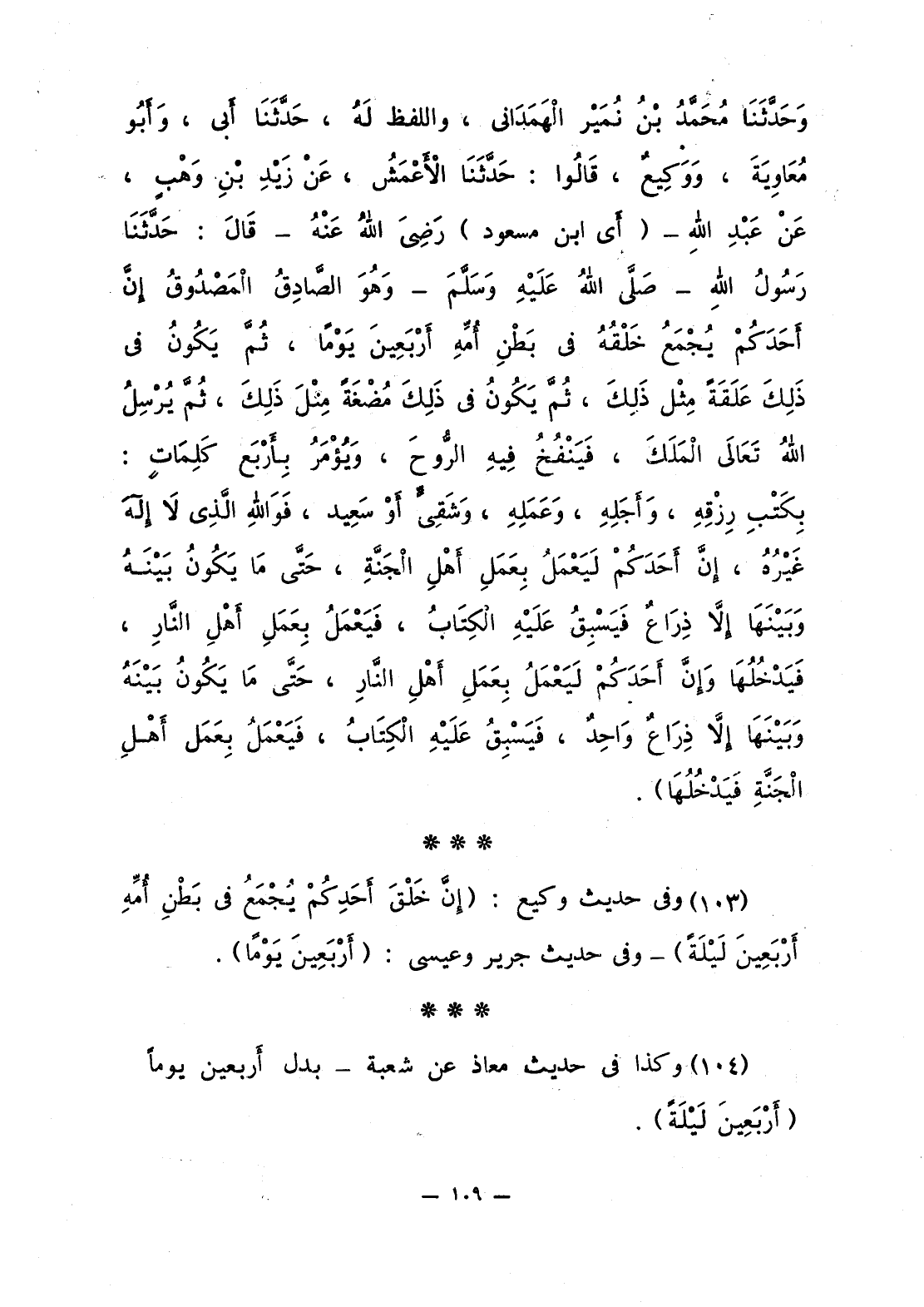 104 - وفي حديث وكيع: (إنَّ خَلْقَ أَحَدِكُمْ يُجْمَعُ في بَطْنِ أُمِّهِ أَرْبَعِينَ لَيْلَةً) - وفي حديث جرير وعيسى: (أَرْبَعِينَ يَوْما).