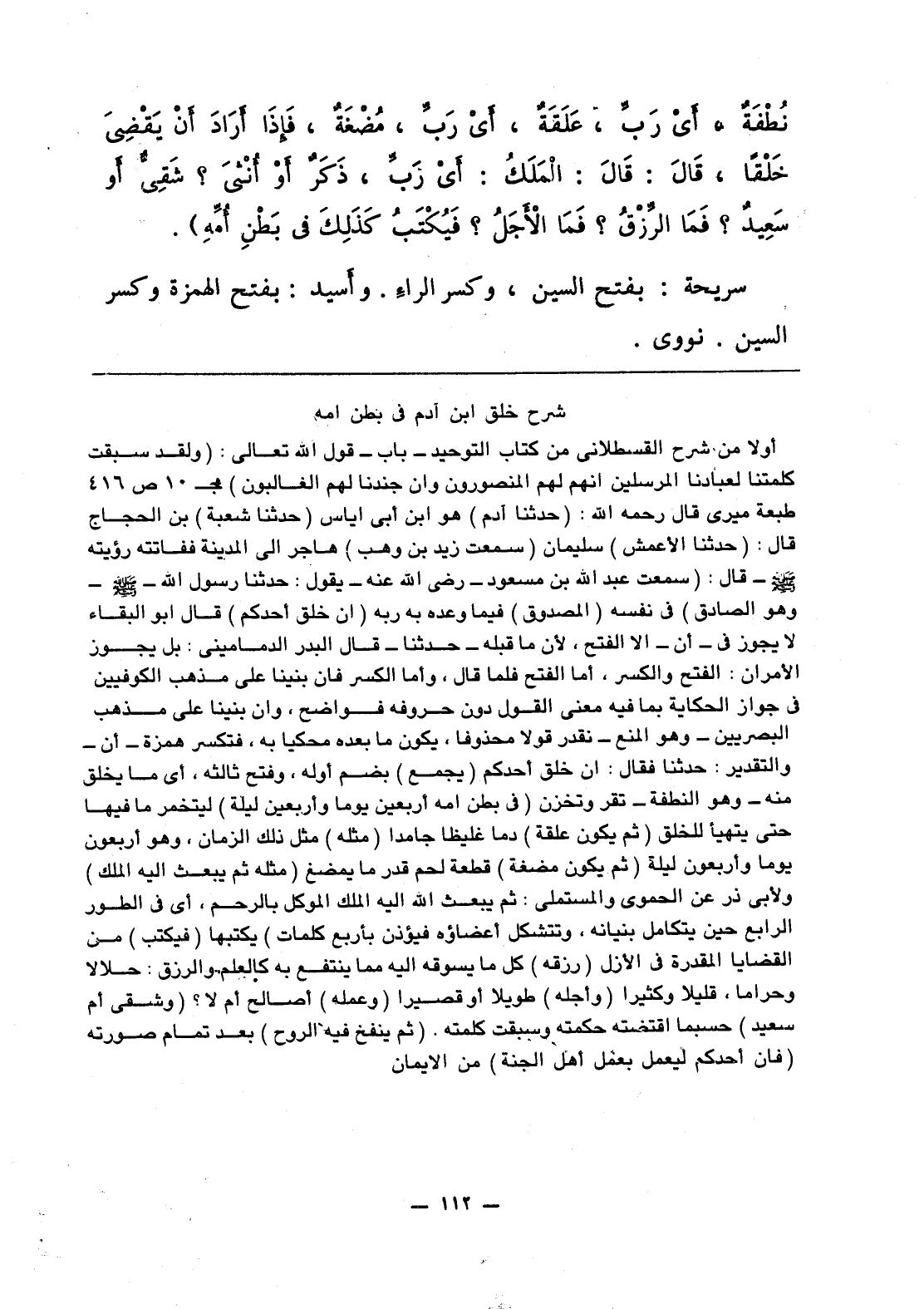 نُطْفَةٌ، أَيْ رَبِّ، عَلَقَةٌ، أَيْ رَبِّ، مُضْغَةٌ، فَإذَا أَرَادَ أَنْ يَقْضِيَ خَلْقا، قَالَ: قَالَ الْمَلَكُ: أَيْ رَبِّ، ذَكَرٌ أَوْ أُنْثَى؟ شَقِيٌّ أَو سَعِيدٌ؟ فَمَا الرِّزْقُ؟ فَمَا الأَجَلُ؟ فَيُكْتَبُ كَذَلِكَ في بَطْنِ أُمِّهِ).