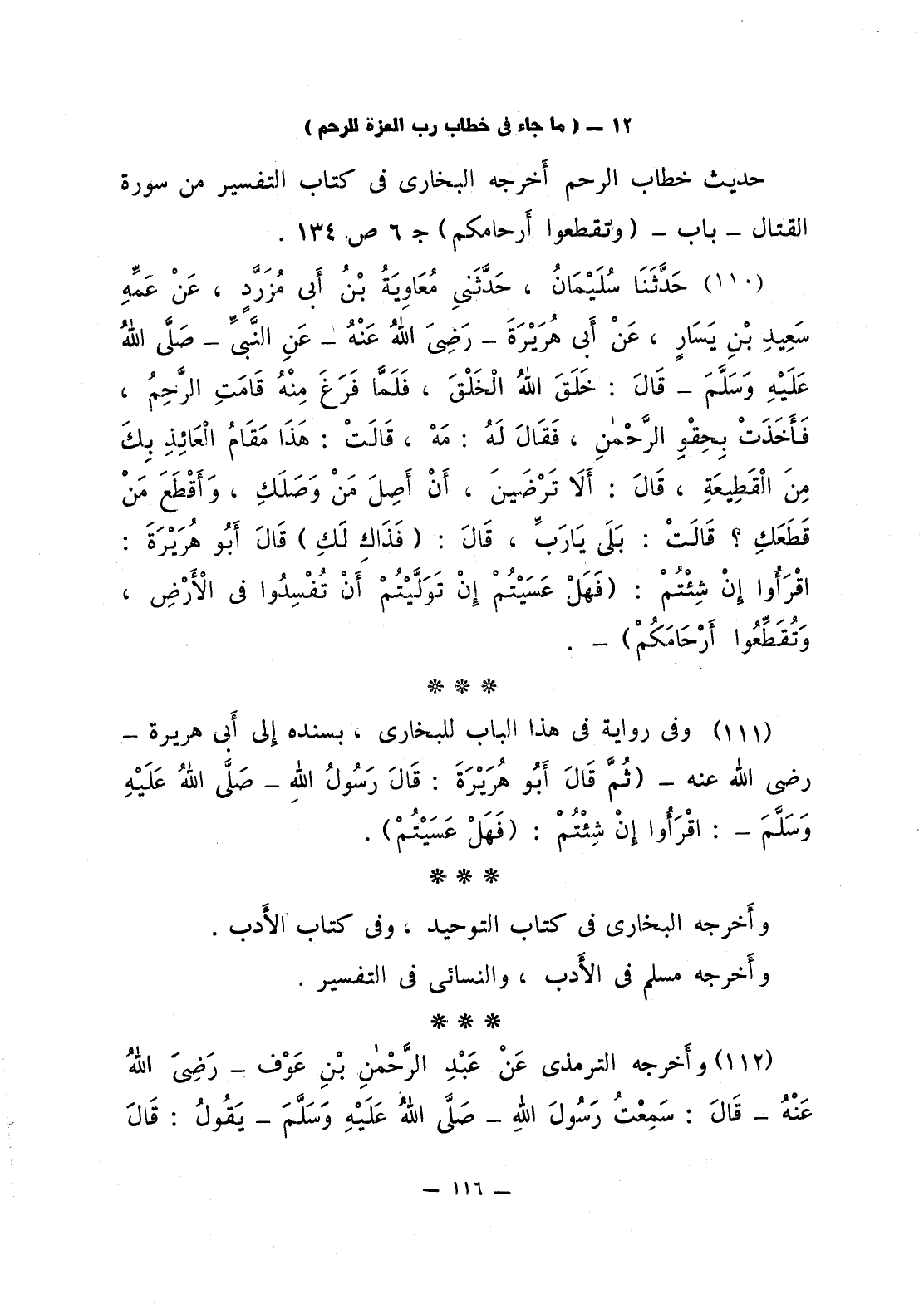 112 - وفي رواية في هذا الباب للبخاري، بسنده إلى أبي هريرة - رَضِيَ اللَّهُ عَنْه - (ثُمَّ قَالَ أَبُو هُرَيْرَةَ: قَالَ رَسُولُ اللَّهِ صلى الله عليه وسلّم: «اقْرَأُوا إنْ شِئْتُمْ: {فَهَلْ عَسَيْتُمْ}».