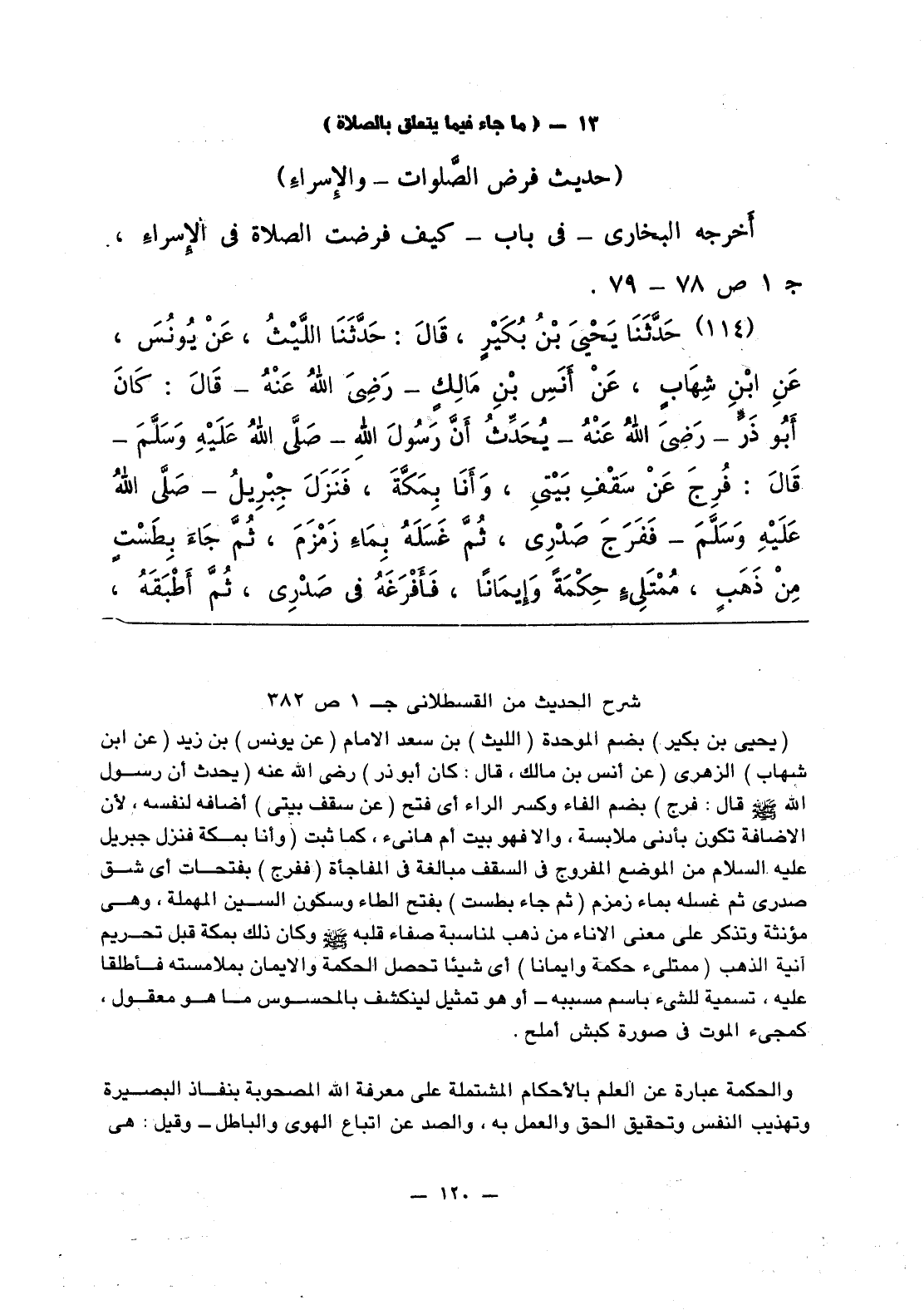 115 - حَدَّثَنَا يَحْيَى بْنُ بُكَيْرٍ، قَالَ: حَدَّثَنَا اللَّيْثُ، عَنْ يُونُسَ، عَنِ ابْنِ شِهَابٍ، عَنْ أَنَسِ بْنِ مَالِكٍ - رَضِيَ اللَّهُ عَنْهُ قَالَ: كانَ أَبُو ذَرٍّ - رَضِيَ اللَّهُ عَنْهُ - يُحَدِّثُ أَنَّ رَسُولَ اللَّهِ قَالَ: «فُرِجَ عَنْ سَقْفِ بَيْتي، وَأَنَا بِمَكَّةَ، فَنَزَلَ جِبْرِيلُ فَفَرَجَ صَدْرِي، ثُمَّ غَسَلَهُ بِمَاءِ زَمْزَمَ، ثُمَّ جَاءَ بِطَسْتٍ مِنْ ذَهَبٍ، مُمْتَلِىءٍ حِكْمَةً وَإيمانا، فَأَفْرَغَهُ في صَدْرِي، ثُمَّ أَطْبَقَهُ،