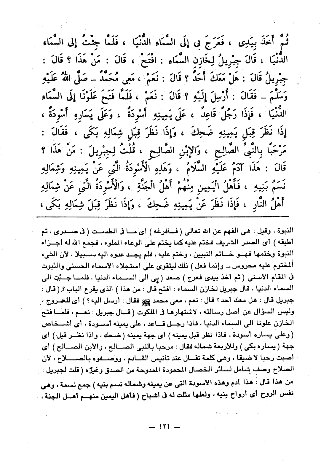 ثُمَّ أَخَذَ بِيَدِي، فَعَرَجَ بي إلَى السَّمَاءِ الدُّنْيَا، فَلَمَّا جِئْتُ إلَى السَّمَاءِ الدُّنْيَا، قَالَ جِبْرِيلُ لِخَازِنِ السَّمَاءِ: افْتَحْ، قَالَ: مَنْ هَذَا؟ قَالَ: جِبْرِيلُ قَالَ: هَلْ مَعَكَ أَحَدٌ؟ قَالَ: نَعَمْ، مَعِي مُحَمَّدٌ فَقَالَ: أُرْسِلُ إلَيْهِ؟ قَالَ: نَعَمْ. فَلَمَّا فَتَحَ عَلَوْنَا إلَى السَّمَاءِ الدُّنْيَا، فَإذَا رَجُلٌ قَاعِدٌ، عَلَى يَمِينِهِ أَسْوِدَةٌ، وَعَلَى يَسَارِهِ أَسْوِدَةٌ، إذَا نَظَرَ قِبَلِ يَمِينِهِ ضَحِكَ، وَإذَا نَظَرَ قِبَلِ شِمالِهِ بَكَى، فَقَالَ: مَرْحَبا بِالنَّبيِّ الصَّالِحِ، وَالإبْنِ الصَّالِحِ، قُلْتُ لِجِبْرِيلَ: مَنْ هَذَا؟ قَالَ: هَذَا آدَمُ عَلَيْهِ السَّلاَمُ، وَهَذِهِ الأَسْوِدَةُ الَّتي عَنْ يَمِينِه وَشِمَالِهِ نَسَمُ بَنِيهِ، فَأَهْلُ الْيَمِينِ مِنْهُمْ أَهْلُ الْجَنَّةِ، وَالأَسْوِدَةُ الَّتي عَنْ شِمَالِهِ أَهْلُ النَّارِ، فَإذَا نَظَرَ عَنْ يَمِينِهِ ضَحِكَ، وَإذَا نَظَرَ قِبَلَ شِمَالِهِ بَكَى،