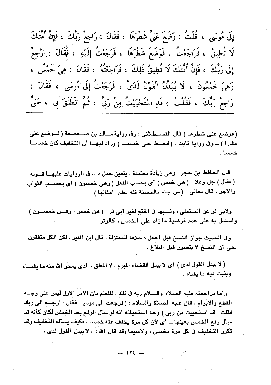 إلَى مُوسَى، قُلْتُ: وَضَعَ عَنِّي شَطْرَهَا، فَقَالَ: رَاجِعْ رَبَّكَ، فَإنَّ أُمَّتَكَ لاَ تُطِيقُ، فَرَاجَعْتُ، فَوَضَعَ شَطْرَهَا، فَرَجَعْتُ إلَيْهِ، فَقَالَ: ارْجِعْ إلَى رَبِّكَ، فَإنَّ أُمَّتَكَ لاَ تُطِيقُ ذَلِكَ، فَرَاجَعْتُهُ، فَقَالَ: هِيَ خَمْسٌ، وَهِيَ خَمْسُونَ، لاَ يُبَدَّلُ الْقَوْلُ لَدَيَّ، فَرَجَعْتُ إلَى مُوسَى، فَقَالَ: رَاجِعْ رَبَّكَ، فَقُلْتُ، قَدِ اسْتَحْيَيْتُ مِنْ رَبِّي، ثُمَّ انْطَلَقَ بي، حَتَّى