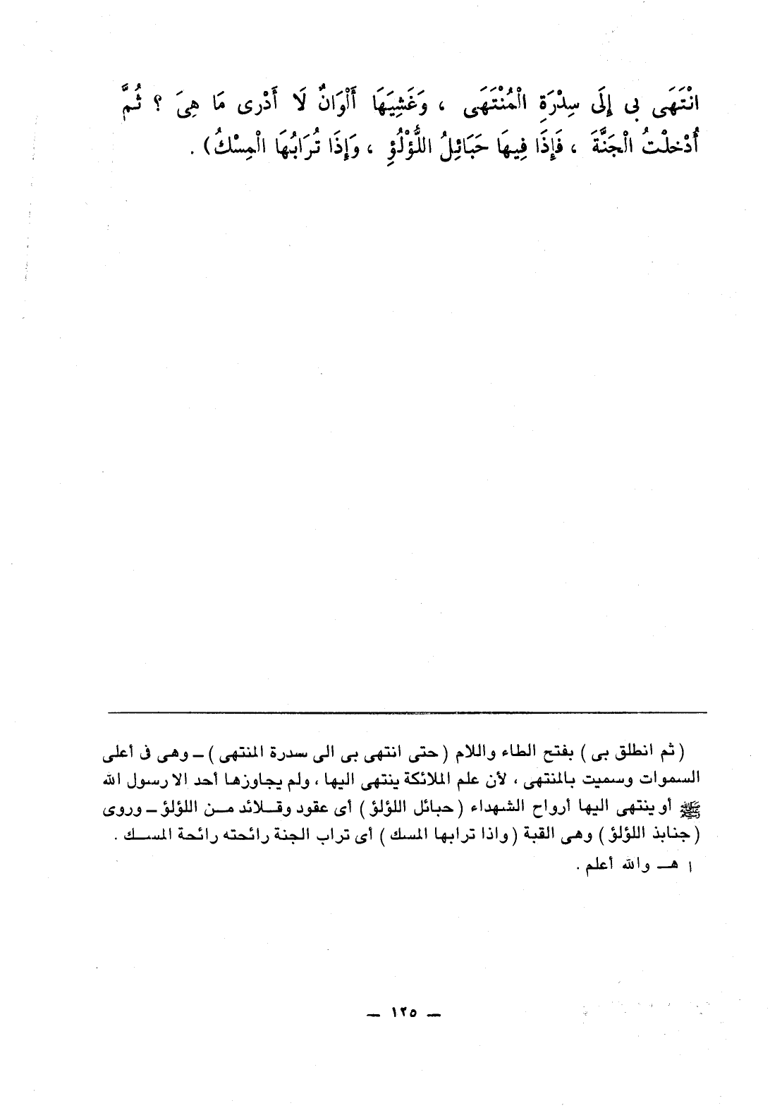 انْتَهَى بي إلَى سِدْرَةِ الْمُنْتَهَى، وَغَشِيَهَا أَلْوَانٌ لاَ أَدْرِي مَا هِيَ؟ ثُمَّ أُدْخِلْتُ الْجَنَّةَ، فَإذَا فِيهَا حَبَائِلُ اللُّوْلُوِ، وَإذَا تُرَابُهَا الْمِسْكُ».