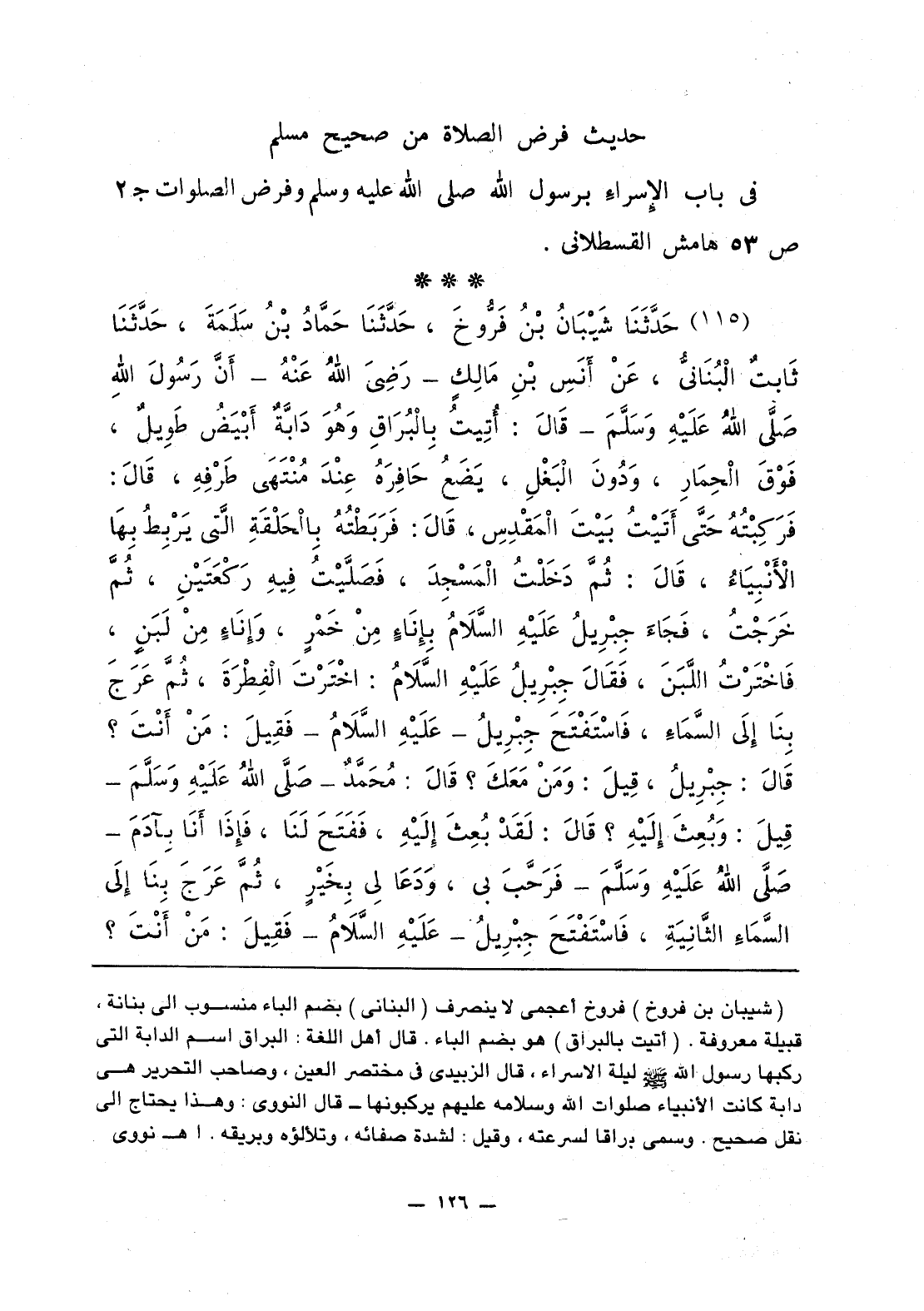116 - حَدَّثَنَا شَيْبَانُ بْنُ فَرُّوخَ، حَدَّثَنَا حَمَّادُ بْنُ سَلَمَةَ، حَدَّثَنَا ثَابتٌ الْبُنَانيُّ، عَنْ أَنَسِ بْنِ مَالِكٍ - رَضِيَ اللَّهُ عَنْهُ - أنَّ رَسُولَ اللَّهِ قَالَ: «أُتِيتُ بِالْبُرَاقِ وَهُوَ دَابَّةٌ أَبْيَضُ طَوِيلٌ، فَوْقَ الْحِمَارِ، وَدُونَ الْبَغْلِ، يَضَعُ حَافِرَهُ عِنْدَ مُنْتَهَى طَرْفِهِ، قَالَ: فَرَكِبْتُهُ حَتَّى أَتَيْتُ بَيْتَ الْمَقْدِسِ، قَالَ: فَرَبَطْتُهُ بِالْحَلَقَةِ الَّتي يَرْبِطُ بِهَا الأَنْبِيَاءُ، قَالَ: ثُمَّ دَخَلْتُ الْمَسْجِدَ، فَصَلَّيْتُ فِيهِ رَكْعَتَيْنِ، ثُمَّ خَرْجْتُ، فَجَاءَ جِبْرِيلُ عَلَيْهِ السَّلاَمُ بِإنَاءٍ مِنْ خَمْرٍ، وَإنَاءٍ مِنْ لَبَنٍ، فَاخْتَرْتُ اللَّبَنَ، فَقَالَ جِبْرِيلُ عَلَيْهِ السَّلاَمُ: اخْتَرْتُ الْفِطْرَةَ، ثُمَّ عَرَجَ بِنَا إلَى السَّمَاءِ، فَاسْتَفْتَحَ جِبْرِيلُ - عَلَيْهِ السَّلاَمُ - فَقِيلَ: مَنْ أَنْتَ؟ قَالَ: جِبْرِيلُ، قِيلَ: وَمَنْ مَعَكَ؟ قَالَ: مُحَمَّدٌ قِيلَ: وَبُعِثَ إلَيْهِ؟ قَالَ: لَقَدْ بُعِثَ إلَيْهِ، فَفَتَحَ لَنَا، فَإذَا أَنَا بِآدَمَ فَرَحَّبَ بي، وَدَعَا لِي بِخَيْرٍ، ثُمَّ عَرَجَ بِنَا إلَى السَّمَاءِ الثَّانِيَةِ، فَاسْتَفْتَحَ جِبْرِيلُ - عَلَيْهِ السَّلاَمُ - فَقِيلَ: مَنْ أَنْتَ؟