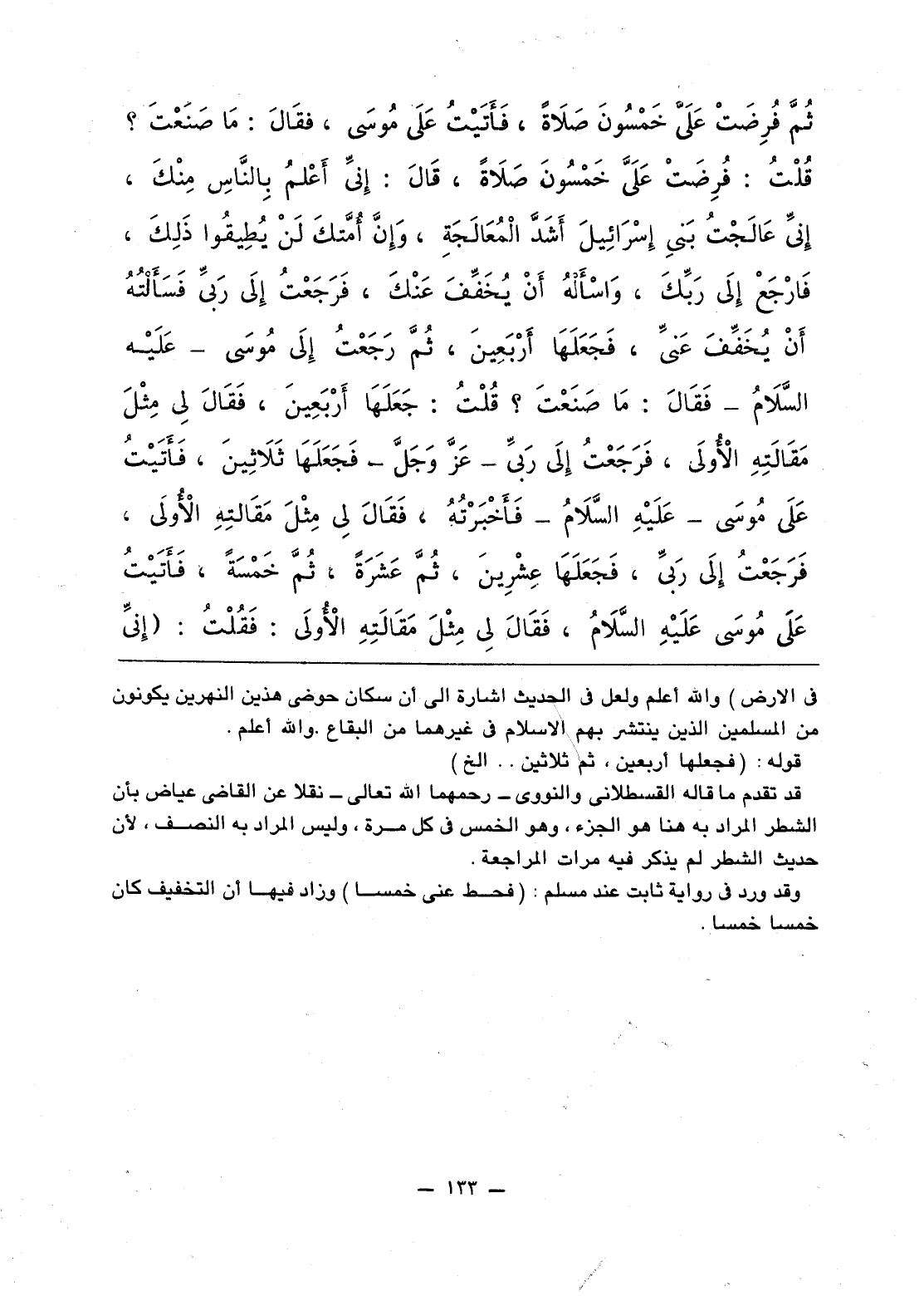 ثُمَّ فُرِضَتْ عَلَيَّ خَمْسُونَ صَلاَةً، فَأَتَيْتُ عَلَى مُوسَى، فَقَالَ: مَا صَنَعْتَ؟ قُلْتُ: فُرِضَتْ عَلَيَّ خَمْسُونَ صَلاَةً، قَالَ: إنِّي أَعْلَمُ بِالنَّاسِ مِنْكَ، إنِّي عَالَجْتُ بَنِي إسْرَائِيلَ أَشَدَّ الْمُعَالَجَةِ، وَإنَّ أُمَّتكَ لَنْ يُطِيقُوا ذَلِكَ، فَارْجَعْ إلَى رَبِّكَ، وَاسْأَلْهُ أَنْ يُخَفِّفَ عَنْكَ، فَرَجَعْتُ إلَى رَبِّي فَسَأَلْتُهُ أَنْ يُخَفِّفَ عَنِّي، فَجَعَلَهَا أَرْبَعِينَ، ثُمَّ رَجَعْتُ إلَى مُوسَى - عَلَيْهِ السَّلامُ - فَقَالَ: مَا صَنَعْتَ؟ قُلْتُ: جَعَلَهَا أَرْبَعِينَ، فَقَالَ لِي مِثْلَ مَقَالَتِهِ الأُولَى، فَرَجَعْتُ إلَى رَبِّي - عَزَّ وَجَلَّ - فَجَعَلَهَا ثَلاَثِينَ، فَأَتَيْتُ عَلَى مُوسَى - عَلَيْهِ السَّلامُ - فَأَخْبَرْتُهُ، فَقَالَ لي مِثْلَ مَقَالَتِهِ الأُولَى، فَرَجَعْتُ إلَى رَبِّي، فَجَعَلَهَا عِشْرِينَ، ثُمَّ عَشَرَةً، ثُمَّ خَمْسَةً، فَأَتَيْتُ عَلَى مُوسَى عَلَيْهِ السَّلاَمُ، فَقَالَ لِي مِثْلَ مَقَالَتِهِ الأُولَى: فَقُلْتُ: «إنَّي