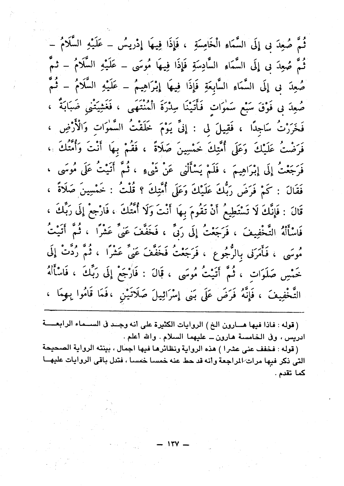 ثُمَّ صَعِدَ بي إلَى السَّمَاءِ الْخَامِسَةِ، فَإذَا فِيهَا إدْريسُ - عَلَيْهِ السَّلامُ - ثُمَّ صُعِدَ بي إلَى السَّماءِ السَّادِسَةِ فَإذَا فِيهَا مُوسَى - عَلَيْهِ السَّلامُ - ثمَّ صُعِدَ بي إلَى السَّمَاءِ السَّابِعَةِ فَإذَا فِيهَا إبْرَاهِيمُ عَلَيْهِ السَّلامُ - ثُمَّ صُعِدَ بي فَوْقَ سَبْع سَموَاتٍ فَأَتَيْنَا سِدْرَةَ الْمُنْتَهَى، فَغَشِيَتْني ضَبَابَةٌ، فَخَرَرْتُ سَاجِدا، فَقِيلَ لِي: إنِّي يَوْمَ خَلَقْتُ السَّموَاتِ وَالأَرْضِ، فَرَضْتُ عَلَيْكَ وَعَلَى أُمَّتِكَ خَمْسِينَ صَلاَةً، فَقُمْ بِهَا أَنْتَ وَأُمَّتَكَ، فَرَجَعْتُ إلَى إبْرَاهِيمَ، فَلَمْ يَسْأَلْني عَنْ شَيْءٍ، ثُمَّ أَتَيْتُ عَلَى مُوسَى، فَقَالَ: كَمْ فَرَضَ رَبُّكَ عَلَيْكَ وَعَلَى أُمَّتِكَ؟ قُلْتُ: خَمْسِينَ صَلاَةً، قَالَ: فَإنَّكَ لاَ تَسْتَطِيعُ أَنْ تَقُومَ بِهَا أَنْتَ وَلاَ أُمَّتَكَ، فَارْجِعْ إلَى رَبِّكَ، فَاسْأَلْهُ التَّخْفِيفَ، فَرَجَعْتُ إلَى رَبِّي، فَخَفَّفْ عَنِّي عَشْرا، ثُمَّ أَتَيْتُ مُوسَى، فَأَمَرَني بِالرُّجُوعِ، فَرَجَعْتُ فَخَفَّفَ عَنِّي عَشْرا، ثُمَّ رُدَّتْ إلَى خَمْسِ صَلَوَاتِ، ثُمَّ أَتَيْتُ مُوسَى، قَالَ: فَارْجَعْ إلَى رَبِّكَ، فَاسْأَلْهُ التَّخْفِيفَ، فَإنَّهُ فَرَضَ عَلَى بَني إسْرَائِيلَ صَلاَتَيْنِ، فَمَا قَامُوا بِهِمَا،