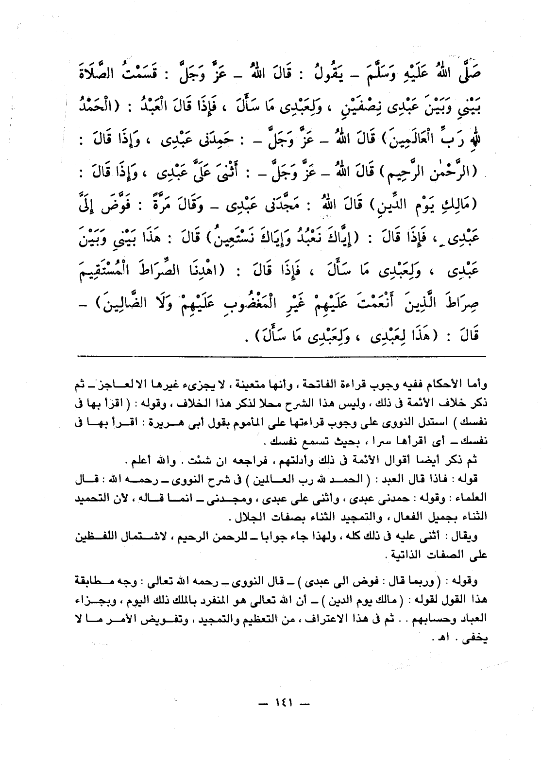 صلى الله عليه وسلم يَقُولُ: قَالَ اللَّهُ - عَزَّ وَجَلَّ - قَسَمْتُ الصَّلاَةَ بَيْني وَبَيْنَ عَبْدِي نِصْفَيْنِ، وَلِعَبْدِي مَا سَأَلَ، فَإذَا قَالَ الْعَبْدُ: {الْحَمْدُ للَّهِ رَبِّ الْعَالَمِينَ} قَالَ اللَّهُ - عَزَّ وَجَلَّ: حَمِدَني عَبْدِي، وَإذَا قَالَ: {الرَّحْمنِ الرَّحِيمِ} قَالَ اللَّهُ - عَزَّ وَجَلَّ - أَثْنَى عَلَيَّ عَبْدِي، وَإذَا قَالَ: {مَلِكِ يَوْمِ الدِّينِ} قَالَ اللَّهُ: مَجَّدَني عَبْدِي - وَقَالَ مَرَّةً: فَوَّضَ إلَيَّ عَبْدِي، فَإذَا قَالَ: {إِيَّاكَ نَعْبُدُ وإِيَّاكَ نَسْتَعِينُ} قَالَ: هَذَا بَيْنِي وَبَيْنَ عَبْدِي، وَلِعَبْدِي مَا سَأَلَ، فَإذَا قَالَ: {اهْدِنَا الصِّرَاطَ الْمُسْتَقِيمَ * صِرَاطَ الَّذِينَ أَنْعَمْتَ عَلَيْهِمْ غَيْرِ الْمَغْضُوبِ عَلَيْهِم وَلاَ الضَّآلِّينَ} قَالَ: هَذَا لِعَبْدِي، وَلِعَبْدِي مَا سَأَلَ».