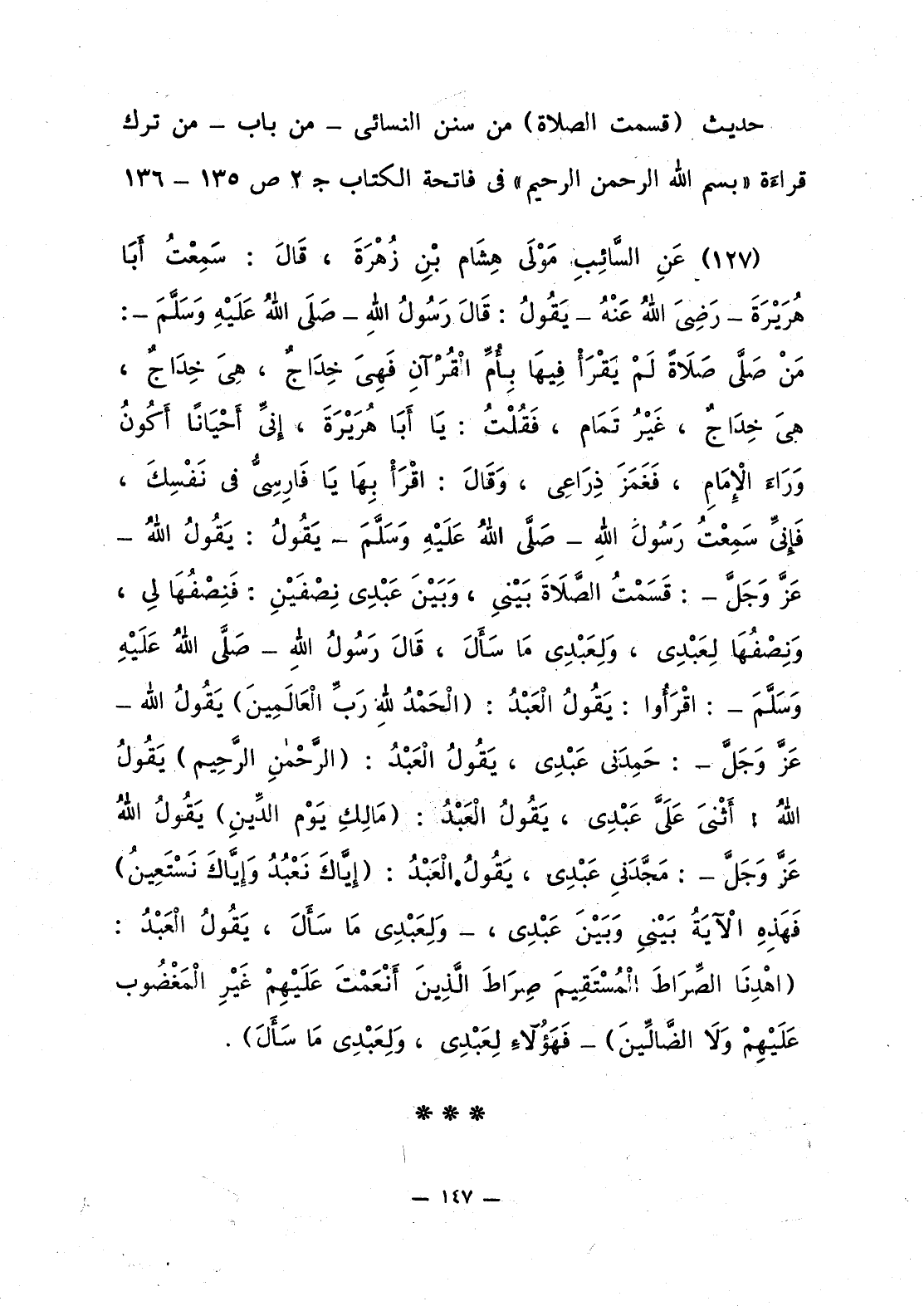 حديث (قسمت الصلاة) من سنن النسائي - من باب - من ترك قراءة «بسم الله الرحمن الرحيم» في فاتحة الكتاب ج - 2 ص 135 - 136.