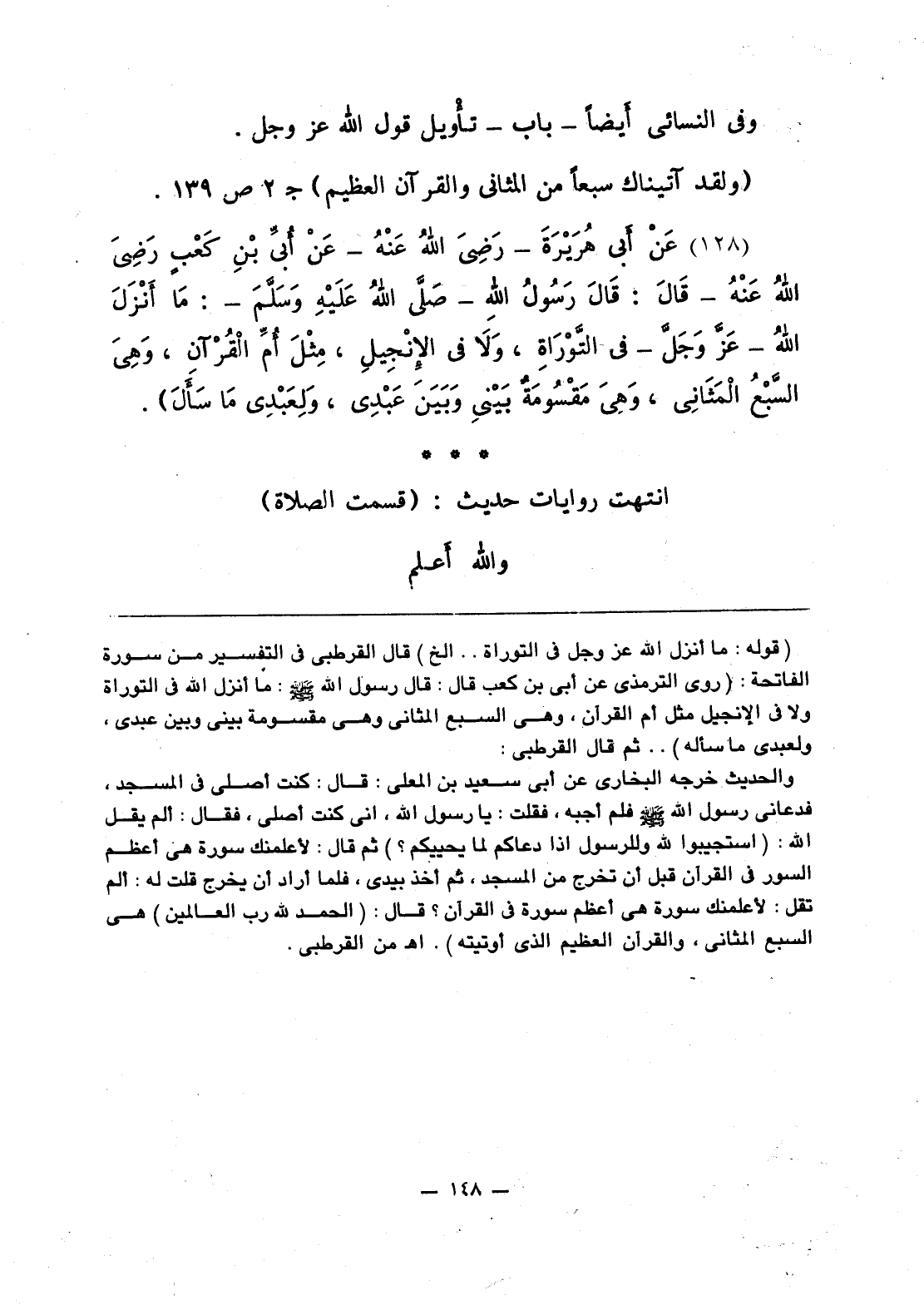 129 - عَنْ أَبي هُرَيْرَةَ - رَضِيَ اللَّهُ عَنْهُ - عَنْ أُبَيِّ بْنِ كَعْبٍ - رَضِيَ اللَّهُ عَنْهُ - قَالَ: قَالَ رَسُولُ اللَّهِ صلى الله عليه وسلّم: «مَا أَنْزَلَ اللَّهُ - عَزَّ وَجَلَّ - في التَّوْرَاةِ، وَلاَ في الإنْجِيلِ، مِثْلَ أُمِّ الْقُرْآنِ، وَهِيَ السَّبْعُ المَثَانِي، وَهِيَ مَقْسُومَةٌ بَيْنِي وبَيْنَ عَبْدِي، وَلِعَبْدِي مَا سَأَلَ».