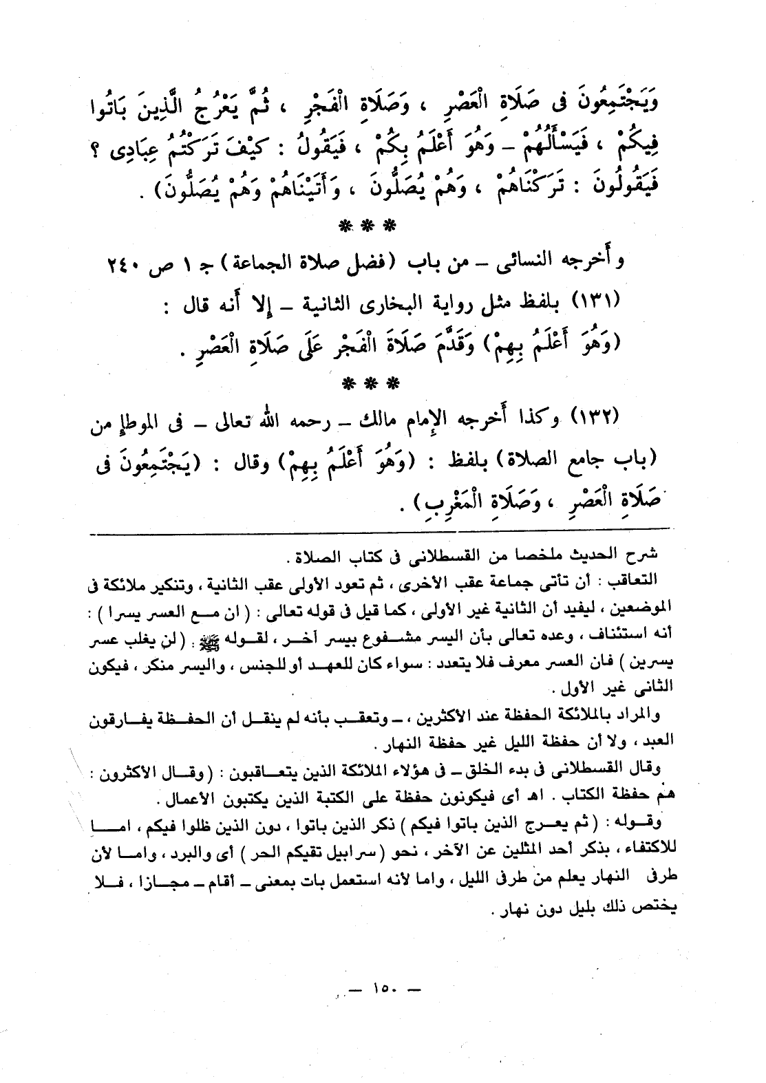 133 - وكذا أخرجه الإمام مالك - رحمه الله تعالى - في الموطأ من (باب جامع الصلاة) بلفظ: (وَهُوَ أَعْلَمُ بِهِمْ) وقال: (يَجْتَمِعُونَ في صَلاَةِ الْعَصْرِ، وَصَلاَةِ الْمَغْرِبِ).
