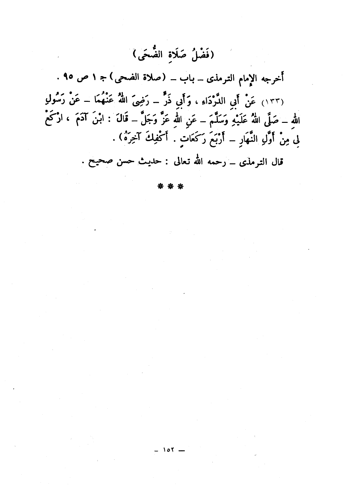 134 - عَنْ أَبِي الدَّرْدَاءِ، وَأَبي ذَرٍّ - رَضِيَ اللَّهُ عَنْهُمَا - عَنْ رَسُولِ اللَّهِ عَنِ اللَّهِ - عَزَّ وَجَلَّ - قَالَ: «ابْنَ آدَمَ، ارْكَعْ لي مِنْ أَوَّلِ النَّهَارِ - أَرْبَعَ رَكَعَاتٍ. أَكْفِكَ آخِرَهُ».