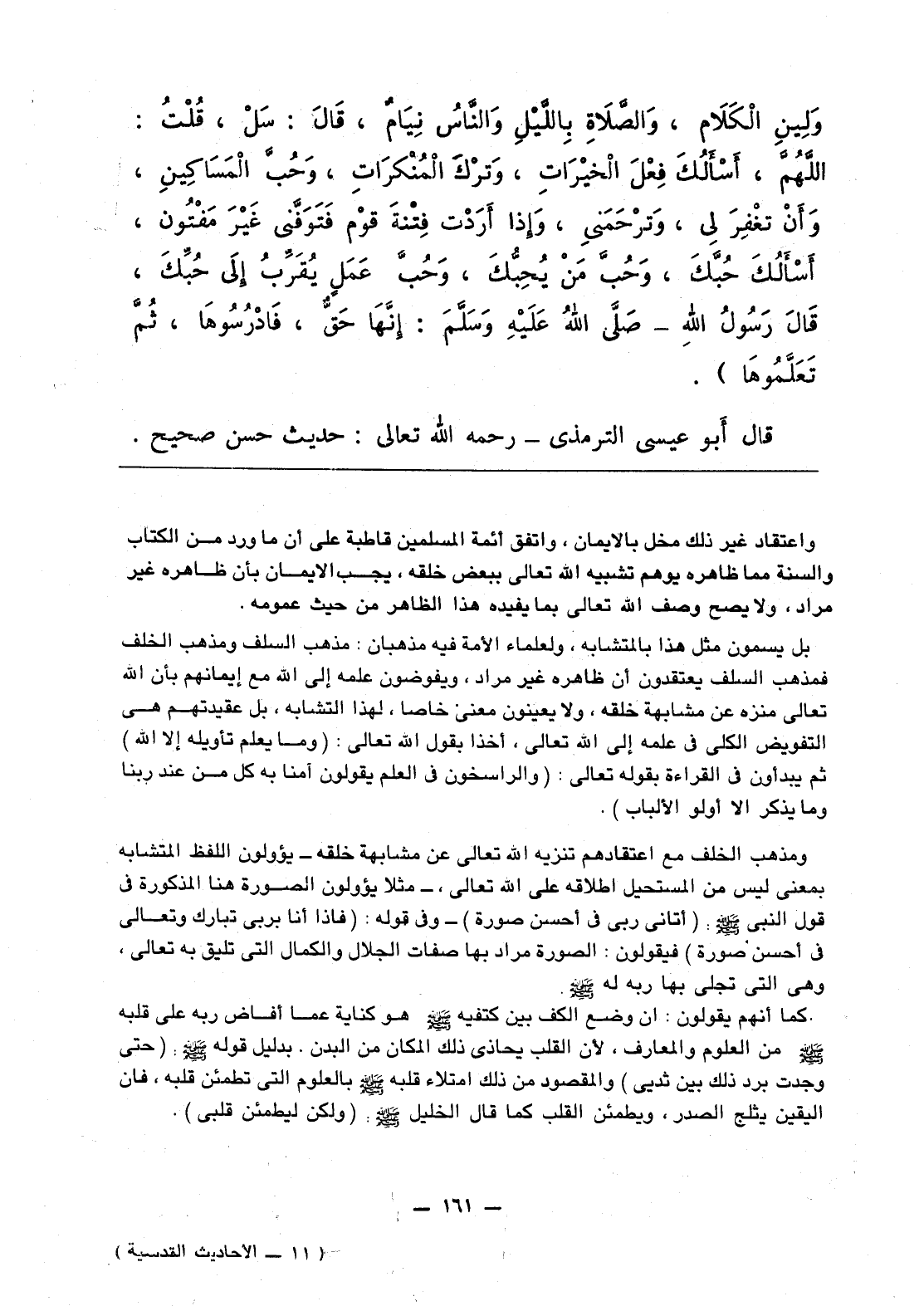 وَلِينِ الْكَلاَم، وَالصَّلاَةِ بِاللَّيْلِ وَالنَّاسُ نِيَامٌ، قَالَ: سَلْ، قُلْتُ: اللَّهُمَّ، أَسْأَلُكَ فِعْلَ الْخَيْرَاتِ، وَتَرْكَ الْمُنْكَرَاتِ، وَحُبَّ الْمَسَاكِينِ، وَأَنْ تَغْفِرَ لي، وَتَرْحَمْني، وَإذَا أَرَدْتَ فِتْنَةَ قَوْمٍ فَتَوَفَّني غَيْرَ مَفْتُون، أَسْأَلُكَ حُبَّكَ، وَحُبَّ مَنْ يُحِبُّكَ، وَحُبَّ عَمَلٍ يُقَرِّبُ إلَى حُبِّكَ»، قَالَ رَسُولُ اللَّهِ صلى الله عليه وسلّم: «إنَّهَا حَقٌّ، فَادْرُسُوهَا، ثُمَّ تَعَلَّمُوهَا».