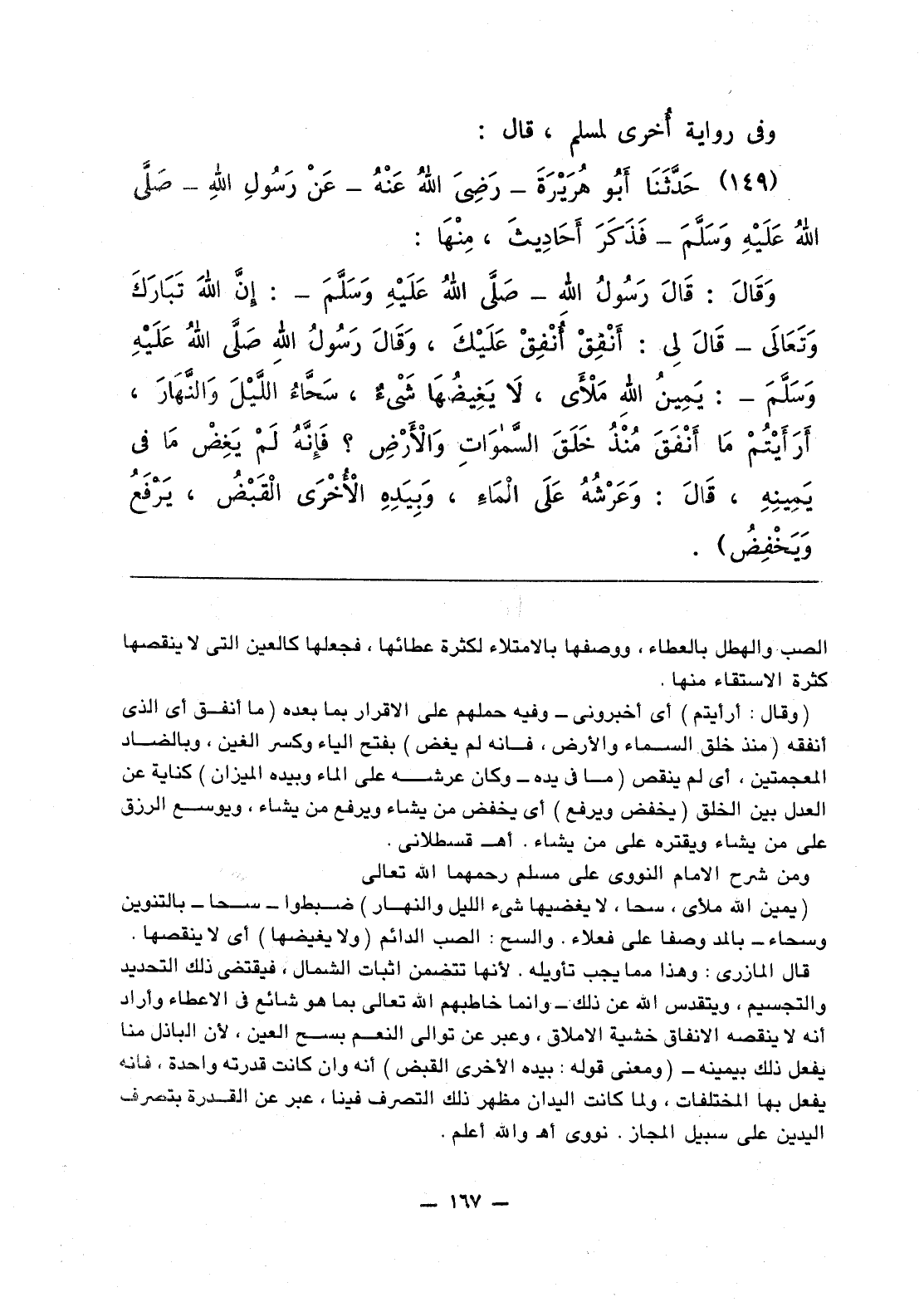 وَقَالَ: قَالَ رَسُولُ اللَّهِ صلى الله عليه وسلّم: «إنَّ اللَهَ تَبَارَكَ وَتعَالَى - قَالَ لي: أَنْفِقْ أُنْفِقْ عَلَيْكَ»، وَقَالَ رَسُولُ اللَّهِ صلى الله عليه وسلّم: «يَمِينُ اللَّهِ مَلأَى، لاَ يَغِيضُهَا شَيْءٌ، سَحَّاءُ اللَّيْلِ وَالنَّهَارَ، أَرَأَيْتُمْ مَا أَنْفَقَ مُنْذُ خَلَقَ السَّموَاتِ وَالأَرْضِ؟ فَإنَّهُ لَمْ يَغِضْ مَا في يَمِينِهِ، قَالَ: وَعَرْشُهُ عَلَى الْمَاءِ، وَبِيَدِهِ الأُخْرَى الْقَبْضُ، يَرْفَعُ وَيَخْفِض».