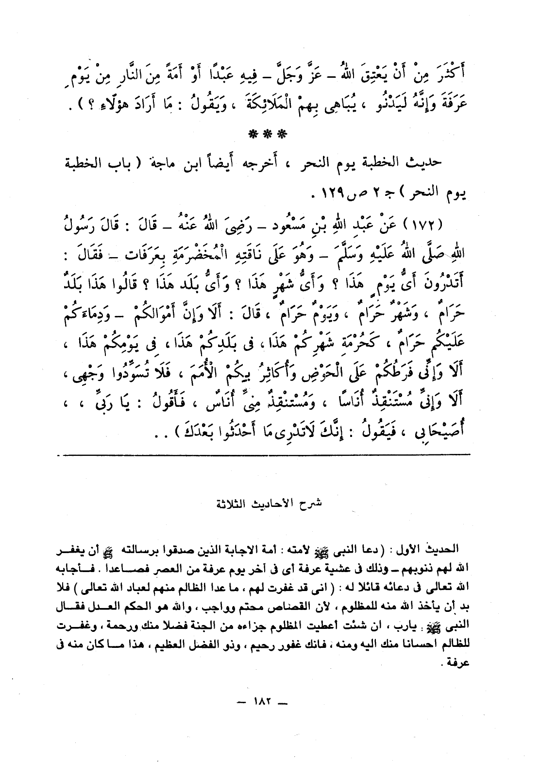 173 - عَنْ عَبْدِ اللَّهِ بن مَسْعُود - رَضِيَ اللَّهُ عَنْهُ - قَالَ: قَالَ رَسُولُ اللَّهِ صلى الله عليه وسلّم وَهُوَ عَلَى نَاقَتِهِ الْمُخَضْرَمَةِ بِعَرَفَات - فقَالَ: «أَتَدْرُونَ أَيُّ يَوْمٍ هَذَا؟ وَأَيُّ شَهْرٍ هَذَا؟ وَأَيُّ بَلَد هَذَا؟ قَالُوا هَذَا بَلَدٌ حَرَامٌ، وَشَهْرٌ حَرَامٌ، وَيَوْمٌ حَرَامٌ، قَالَ: أَلاَ وَإنَّ أَمْوَالَكُمْ - وَدِمَاءَكُمْ عَلَيْكُمْ حَرَامٌ، كَحُرْمَةِ شَهْرِكُمْ هَذَا، في بَلَدِكُمْ هَذَا، في يَوْمِكُمْ هَذَا، أَلاَ وَإنِّي فَرَطْكُمْ عَلَى الْحَوْضِ وَأَكَاثِرُ بِكُمْ الأُمَمَ، فَلاَ تُسَوِّدُوا وَجْهِي، أَلاَ وَإنِّي مُسْتَنْقِذٌ أُنَاسا، وَمُسْتَنْقِذٌ مِنَّي أُنَاسٌ، فَأَقولُ: يَا رَبِّي، أُصَيْحَابِي، فَيَقُولُ: إنَّكَ لاَ تَدْرِي مَا أَحْدَثُوا بَعْدَكَ».