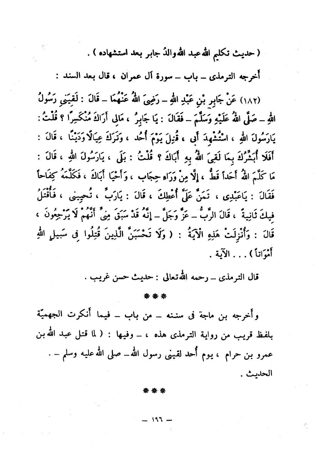 183 - عَنْ جَابِرِ بْنِ عَبْدِ اللَّهِ - رَضِيَ اللَّهُ عَنْهُمَا - قَالَ: لَقِيَني رَسُولُ اللَّهِ صلى الله عليه وسلّم فَقَالَ: يَا جَابِرُ، مَا لِي أَرَاكَ مُنْكَسِرا؟ قُلْتُ: يَا رَسُولَ اللَّهِ، اسْتُشْهِدَ أَبي، قُتِلَ يَوْمَ أُحُد، وَتَرَكَ عِيَالاً وَدَيْنا، قَالَ: أَفَلاَ أُبَشِّرُكَ بِمَا لَقِيَ اللَّهُ بِهِ أَبَاكَ؟ قُلْتُ: بَلَى، يَا رَسُولَ اللَّهِ، قَالَ: «مَا كَلَّمَ اللهُ أَحدا قَطُّ، إلاَّ منْ وَرَاءِ حِجَاب، وَأَحْيا أَبَاكَ، فَكَلَّمَهُ كِفَاحا فَقَالَ: يَا عَبْدِي، تَمَنَّ عَلَيَّ أُعْطِكَ، قَالَ: يا رَبِّ، تُحْيِيني، فَأُقْتَلُ فِيكَ ثَانِيةً، قَالَ الرَّبُ - عَزَّ وَجَلَّ - إنَّهُ قَدْ سَبَقَ مِنِّي أَنَّهُمْ لاَ يَرْجِعُونَ، قَالَ: وَأُنْزِلَتْ هَذِهِ الآيَةُ: {وَلاَ تَحْسَبَنَّ الَّذِينَ قُتِلُواْ فِي سَبِيلِ اللَّهِ أَمْوَاتاً} ... الآية.