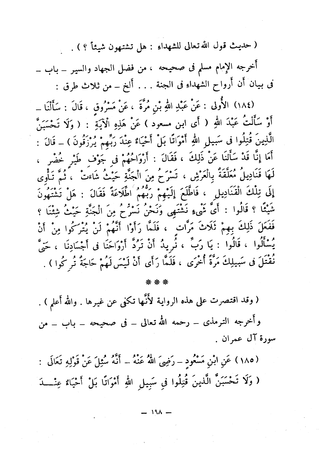 185 - الأُولى: عَنْ عَبْدِ اللَّهِ بن مُرَّةً، عَنْ مَسْرُوقٍ، قَالَ: سَأَلْنَا - أَوْ سَأَلْتُ عَبْدَ اللَّهِ (أَي ابن مسعود) عَنْ هَذِهِ الآيَةِ: {وَلاَ تَحْسَبَنَّ الَّذِينَ قُتِلُواْ فِي سَبِيلِ اللَّهِ أَمْوَاتاً بَلْ أَحْيَاءٌ عِندَ رَبِّهِمْ يُرْزَقُونَ} - قَالَ: أَمَا إنَا قَدْ سَأَلَنَا عَنْ ذَلِكَ، فَقَالَ: «أَرْوَاحُهُمْ في جَوْفِ طَيْرٍ خُضْر، لَهَا قَنَادِيلُ مُعَلَّقَةٌ بِالْعَرْشِ، تَسْرَحُ مِنَ الْجَنَّةِ حَيْثُ شَاءَتْ، ثُمَّ تَأْوِي إلَى تِلْكَ الْقَنَادِيلِ، فَاطَّلَعَ إلَيْهِمْ رَبُّهُمْ اطِّلاَعَةً فَقَالَ: هَلْ تَشْتَهُونَ شَيْئا؟ قالُوا: أَيَّ شَيْءٍ نَشْتَهِي وَنَحْنُ نَسْرَحُ مِنَ الْجَنَّةِ حَيْثُ شِئْنَا؟ فَفَعَلَ ذَلِكَ بِهِمْ ثَلاَثَ مَرَّاتٍ، فَلَمَّا رَأَوْا أَنَّهُمْ لَنْ يُتْرَكُوا مِنْ أَنْ يُسْأَلُوا، قَالُوا: يَا رَبِّ، نُرِيدُ أَنْ تَرُدَّ أَرْوَاحَنَا في أَجْسَادِنَا، حَتَّى نُقْتَلَ في سَبِيلِكَ مَرَّةً أُخْرَى، فَلَمَّا رَأَى أَنْ لَيْسَ لَهُمْ حَاجَةٌ ترِكُوا».