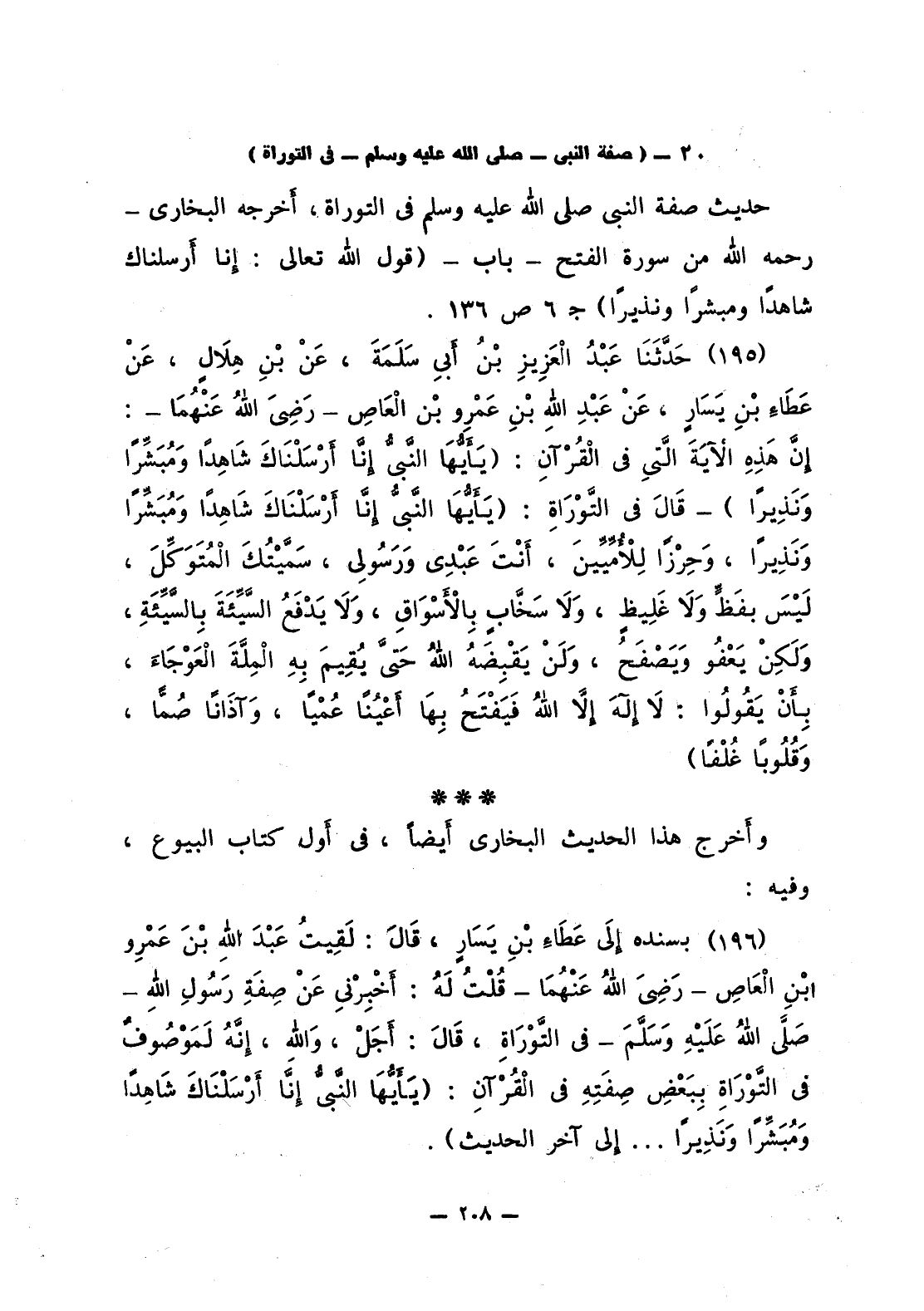 197 - بسنده إلَى عَطَاءِ بْنِ يَسَارٍ، قَالَ: لَقِيتُ عَبْدَ اللَّهِ بنَ عَمْرِو بْنِ الَعَاصِ - رَضِيَ اللَّهُ عَنْهُمَا - قُلْتُ لَهُ: أَخْبِرْنِي عَنْ صِفَةِ رَسُولِ اللَّهِ في التَّوْرَاةِ، قَالَ: أَجَلْ، وَاللَّهِ، إنَّهُ لَمَوْصُوفٌ في التَّوْرَاةِ بِبَعْضِ صِفَتِهِ في الْقُرْآنِ: {يأَيُّهَا النَّبِيُّ إِنَّآ أَرْسَلْنَاكَ شَاهِداً وَمُبَشِّراً وَنَذِيراً} إلى آخر الحديث.