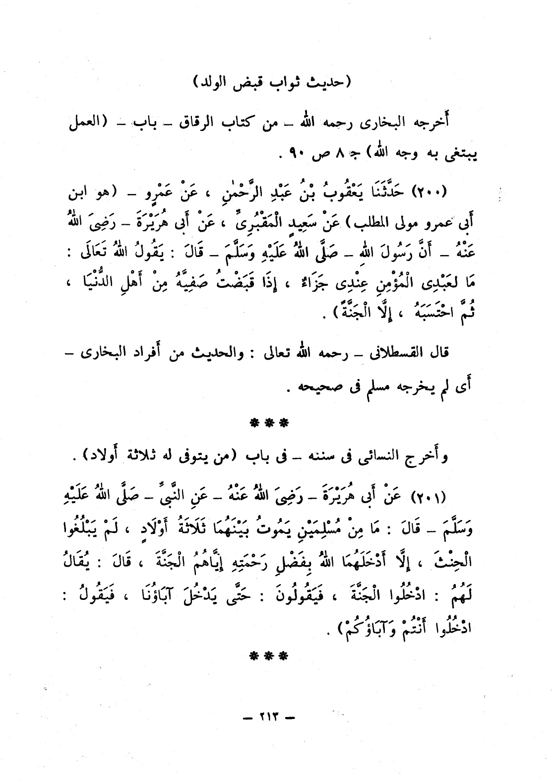 202 - عَنْ أَبي هُرَيْرَةَ - رَضِيَ اللَّهُ عَنْهُ - عَنِ النَّبيِّ قَالَ: «مَا مِنْ مُسْلِمَيْنِ يَمُوتُ بَيْنَهُمَا ثَلاَثَةُ أَوْلاَدٍ، لَمْ يَبْلُغُوا الْحِنْثَ، إلاَّ أَدْخَلَهُمَا اللَّهُ بِفَضْلِ رَحْمَتهِ إيَّاهُمُ الْجَنَّةَ، قَالَ: يُقَالُ لَهُمُ: ادْخُلُوا الْجَنَّةَ، فَيَقُولُونَ: حَتَّى يَدْخُلَ آبَاوُنَا، فَيَقُولُ: ادْخُلُوا أَنْتُمْ وَآبَاوُكُمْ».