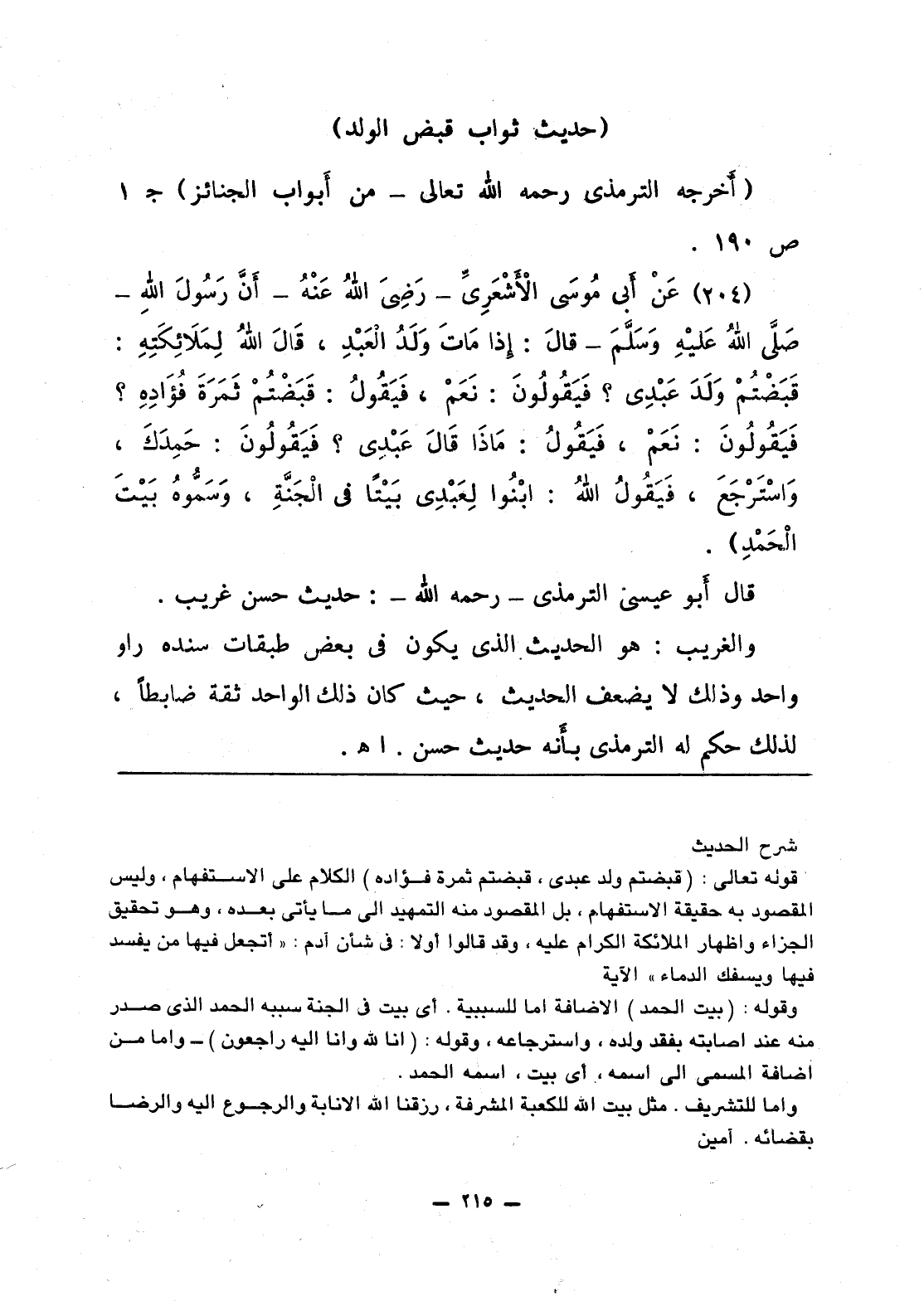 205 - عَنْ أَبي مُوسَى الأَشْعَرِيِّ - رَضِيَ اللَّهُ عَنْهُ - أَنَّ رَسُولَ اللَّهِ قَالَ: «إذَا مَاتَ وَلَدُ الْعَبْدِ، قَالَ اللَّهُ لِمَلاَئِكَتِه: قَبَضْتُمْ وَلَدَ عَبْدِي؟ فَيَقُولُونَ: نَعَمْ، فَيَقُولُ: قَبَضْتُمْ ثَمَرَةَ فُوَادِهِ؟ فَيَقُولُونَ: نَعَمْ، فَيَقُولُ: مَاذَا قَالَ عَبْدِي؟ فَيَقُولُونَ: حَمِدَكَ، وَاسْتَرْجَعَ، فَيَقُولُ اللَّهُ: ابْنُوا لِعَبْدِي بَيْتا في الْجَنَّةِ، وَسَمُّوهُ بَيْتَ الْحَمْدِ».