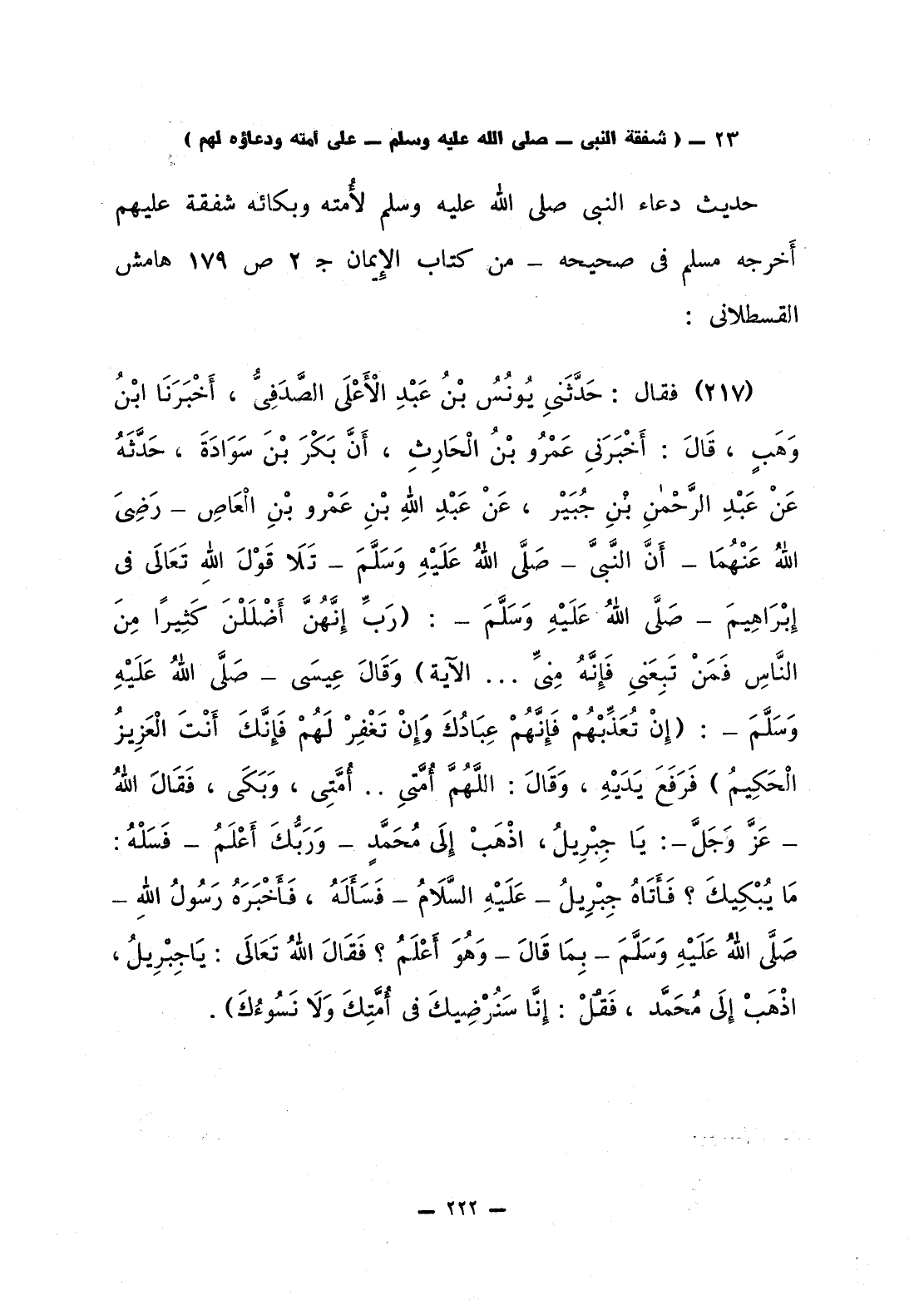 218 - فقال: حَدَّثَني يُونُسُ بْنُ عَبْدِ الأَعْلَى الصَّدَفِيُّ، أَخْبَرَنَا ابْنُ وَهَبٍ، قَالَ: أَخْبَرَني عَمْرُو بْنُ الْحَارِثِ، أَنَّ بَكْرَ بْنَ سَوَادَةَ، حَدَّثَهُ عَنْ عَبْدِ الرَّحْمنِ بْنِ جُبَيْر، عَنْ عَبْدِ اللَّهِ بن عَمْرو بْنِ الْعَاصِ - رَضِيَ اللَّهُ عَنْهُمَا - أَنَّ النَّبِيِّ صلى الله عليه وسلم تَلاَ قَوْلَ اللَّهِ تَعَالَى في إبْرَاهِيمَ: {رَبِّ إِنَّهُنَّ أَضْلَلْنَ كَثِيراً مِّنَ النَّاسِ فَمَن تَبِعَنِي فَإِنَّهُ مِنِّي} الآية. وقَالَ عِيسَى: {إِن تُعَذِّبْهُمْ فَإِنَّهُمْ عِبَادُكَ وَإِن تَغْفِرْ لَهُمْ فَإِنَّكَ أَنتَ الْعَزِيزُ الْحَكِيمُ} فَرَفَعَ يَدَيْهِ، وَقَالَ: اللَّهُمَّ أُمَّتي ... أُمَّتي، وَبَكَى، فَقَالَ اللَّهُ - عَزَّ وَجَلَّ - يَا جِبْرِيلُ، اذْهَبْ إلَى مُحَمَّدٍ - وَرَبُّكَ أَعْلَمُ - فَسَلْهُ: مَا يُبْكِيكَ؟ فَأَتَاهُ جِبْرِيلُ - عَلَيْهِ السَّلاَمُ - فَسَأَلَهُ، فَأَخْبَرَهُ رَسُولُ اللَّهِ صلى الله عليه وسلّم بِمَا قَالَ - وَهُوَ أَعْلَمُ؟ فَقَالَ اللَّهُ تَعَالَى: يَا جِبْرِيلُ، اذْهَبْ إلَى مُحَمَّد، فَقُلْ: إنَّا سَنُرْضِيكَ في أُمَّتِكَ وَلاَ نَسُوءُكَ».