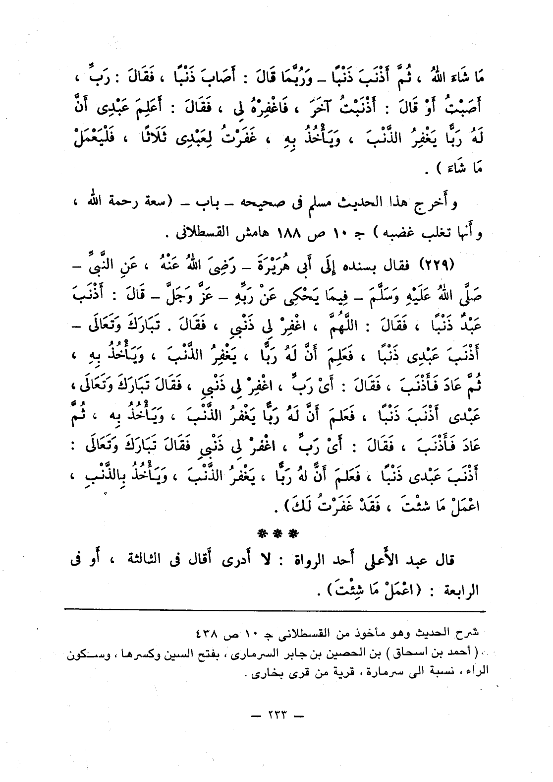 230 - فقال بسنده إلى أَبي هُرَيْرَةَ - رَضِيَ اللَّهُ عَنْهُ، عَنِ النَّبيِّ فِيمَا يَحْكِي عَنْ رَبِّهِ - عَزَّ وَجَلَّ - قَالَ: «أَذْنَبَ عَبْدٌ ذَنْبا، فَقَالَ اللَّهُمَّ، اغْفِرْ لي ذَنْبي، فَقَالَ: تَبَارَكَ وَتَعَالى - أَذْنَبَ عَبْدِي ذَنْبا، فَعَلِمَ أَنَّ لَهُ رَبًّا، يَغْفِرُ الذَّنْبَ، وَيَأْخُذُ بهِ، ثُمَّ عَادَ فَأَذْنَبَ، فَقَالَ: أَيْ رَبِّ، اغْفِرْ لِي ذنْبي، فَقَالَ تَبَارَكَ وَتَعَالى، عَبْدي أَذْنَب ذَنْبا، فَعَلِمَ أَنَّ لَهُ رَبًّا يَغْفرُ الذَّنْبَ، وَيأْخُذُ بهِ، ثُمَّ عَادَ فَأَذْنَبَ، فَقَالَ: أَيْ رَبِّ، اغْفِرْ لي ذَنْبي فَقَالَ تَبَارَكَ وَتعَالَى: أَذْنَبَ عَبْدي ذَنْبا، فَعَلِمَ أَنَّ لَهُ رَبًّا، يَغْفِرُ الذَّنْبَ، وَيَأْخُذُ بِالذَّنْبِ، اعمَلْ مَا شئْتَ، فَقَدْ غَفَرْتُ لَكَ».