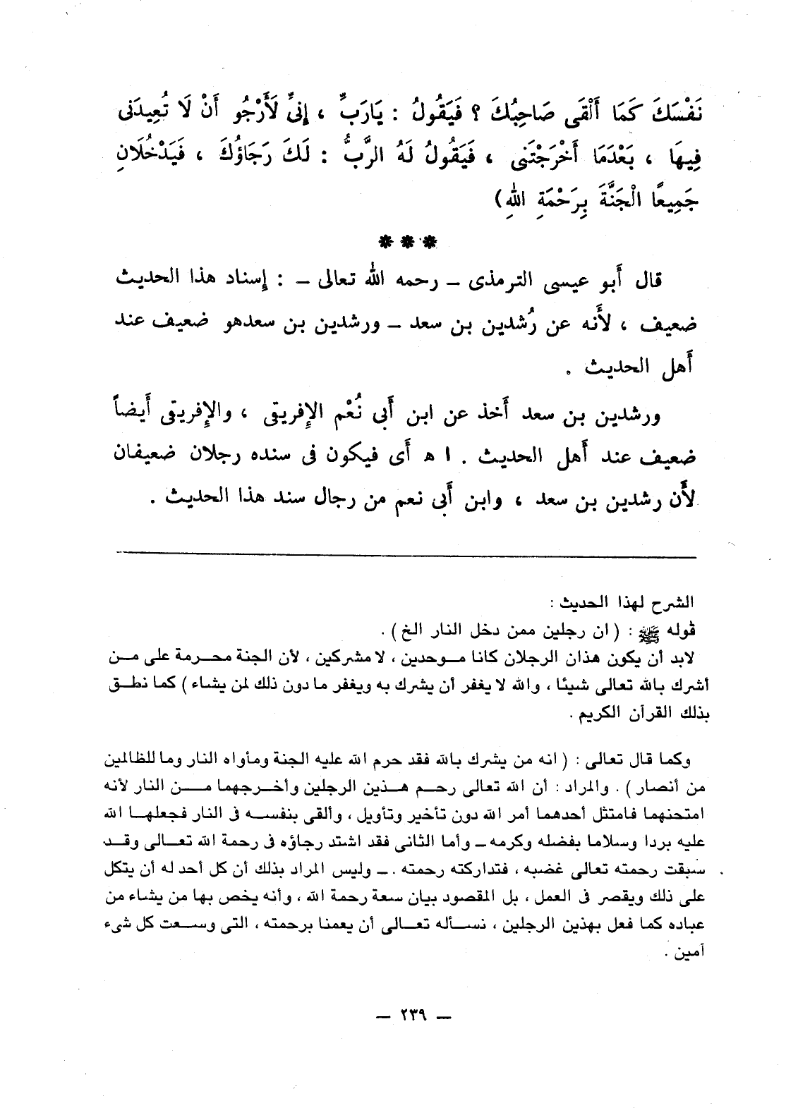 نَفْسَكَ كَمَا أَلْقَى صَاحِبُكَ؟ فَيَقُولُ: يَا رَبِّ، إنِّي لأَرْجُو أَنْ لاَ تُعِيدَني فِيهَا، بَعْدَما أَخْرجْتَني، فَيَقُولُ لَهُ الرَّبُّ: لَكَ رَجَاوُكَ، فَيَدْخُلاَنِ جَمِيعا الْجَنَّةَ بِرَحْمَةِ اللَّهِ».