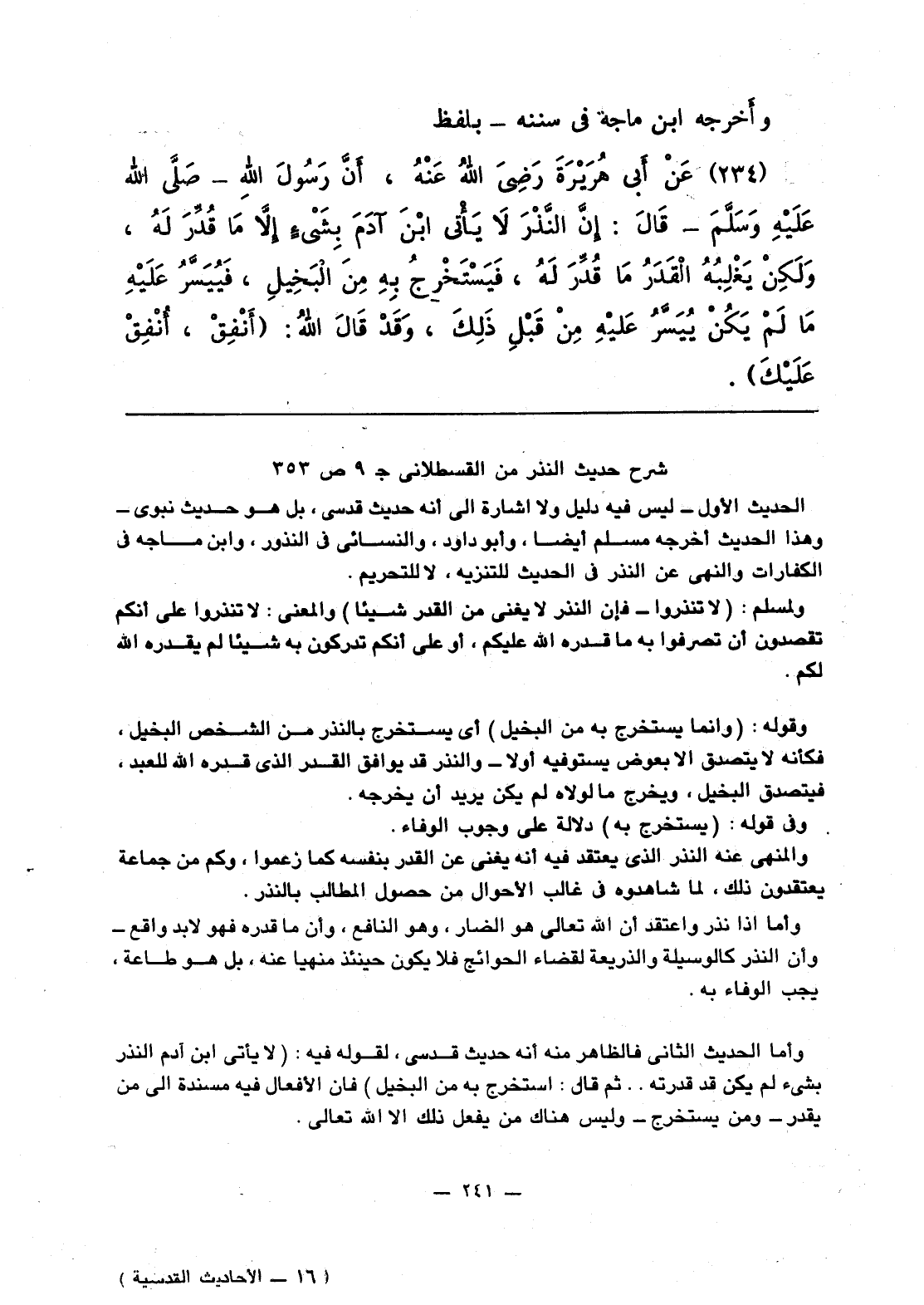 235 - عَنْ أَبي هُرَيْرَةَ رَضِيَ اللَّهُ عَنْهُ، أَنَّ رَسُولَ اللَّهِ قَالَ: «إنَّ النَّذْرَ لاَ يَأْتِي ابْنَ آدَمَ بِشَيْءٍ إلاَّ مَا قُدِّرَ لَهُ، وَلَكِنْ يَغْلِبُهُ الْقَدَرُ مَا قُدِّرَ لَهُ، فَيَسْتَخْرِجُ بِهِ مِنَ الْبَخِيلِ، فَيُيَسِّرُ عَلَيْهِ مَا لَمْ يَكُنْ يُيَسَّرُ عَلَيْهِ مِنْ قَبْلِ ذَلِكَ، وَقَدْ قَالَ اللَّهُ: أَنْفِقْ، أُنْفِقْ عَلَيْكَ».
