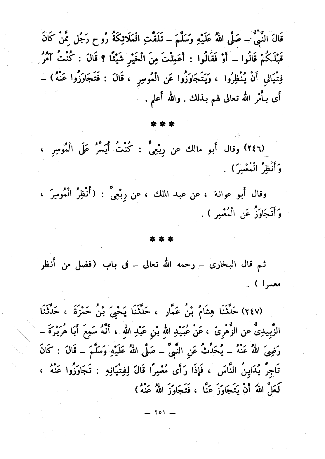 248 - حَدَّثَنَا هِشَامُ بْنُ عَمَّار، حَدَّثَنَا يَحْيَى بْنُ حَمْزةَ، حَدَّثَنَا الزَّبِيدِيُّ عن الزُّهْرِيّ، عَنْ عُبَيْد اللَّهِ بْنِ عَبْدِ اللَّهِ، أَنَّهُ سَمِعَ أَبَا هُرَيْرَةَ - رَضِيَ اللَّهُ عَنْهُ - يُحَدِّثُ عَنِ النَّبيِّ قَالَ: «كانَ تَاجِرٌ يُدَايِنُ النَّاسَ، فَإذَا رَأَى مُعْسِرا قَالَ لِفِتْيَانِهِ: تَجَاوَزُوا عَنْهُ، لَعَلَّ اللَّهَ أَنْ يَتَجَاوَزَ عَنَّا، فَتَجَاوَزَ اللَّهُ عَنْهُ».