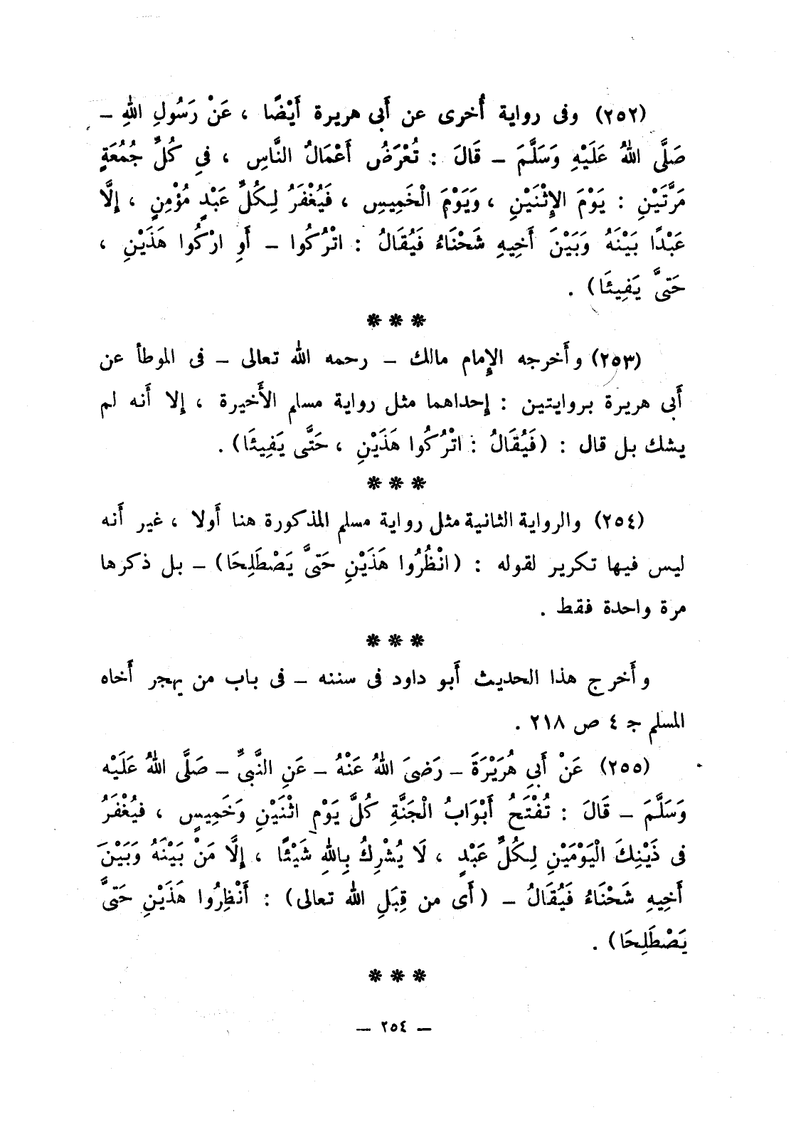 253 - وفي رواية أخرى عن أبي هريرة أيضا، عن رَسُولِ اللَّهِ قَالَ: «تُعْرَضُ أَعْمَالُ النَّاسِ، في كُلِّ جُمُعَةٍ مَرَّتَيْنِ: يَوْمَ الاثْنَيْنِ، وَيَوْمَ الْخَمِيسِ، فَيُغْفَرُ لِكُلِّ عَبْدٍ مُؤمِنٍ، إلاَّ عَبْدا بَيْنَهُ وبَيْنَ أَخِيهِ شَحْناءُ فَيُقالُ: اتْرُكوا - أَوِ ارْكُوا هَذَيْنِ، حَتَّى يَفِيئَا».