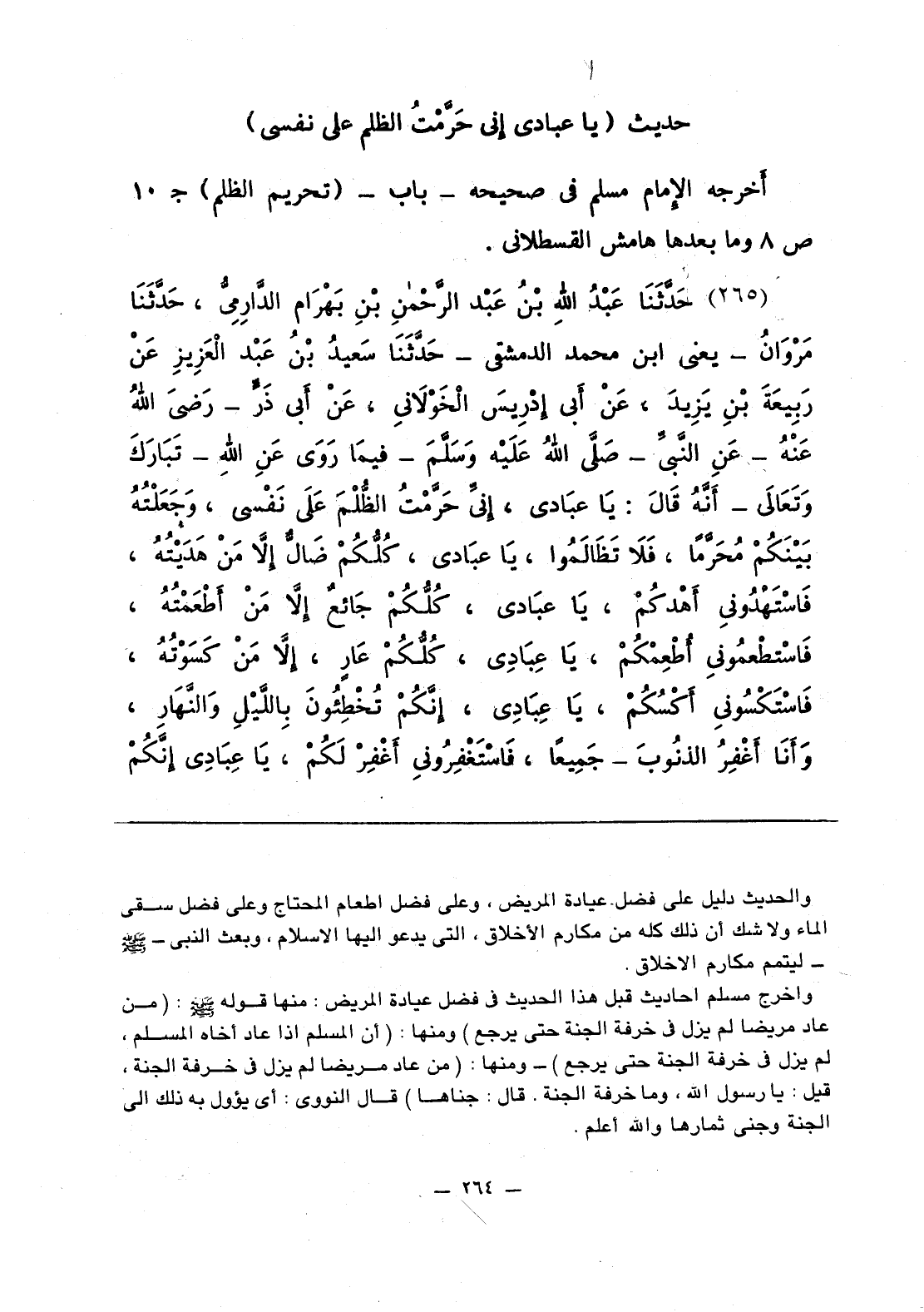 266 - حَدَّثَنَا عَبْدُ اللَّهِ بن عَبْدِ الرَّحْمنِ بْنِ بَهْرَام الدَّارِمِيُ، حَدَّثَنَا مَرْوَانُ - يعني ابن محمد الدمشقي - حَدَّثَنَا سَعيدُ بْنُ عَبْد الْعَزِيزِ عَنْ رَبِيعَةَ بْنِ يَزِيدَ، عَنْ أَبي إدْرِيسَ الْخَوْلاَنِي، عَنْ أَبِي ذَرٍّ - رَضِيَ اللَّهُ عَنْهُ - عَنِ النَّبيِّ فيمَا رَوَى عَنِ اللَّهِ - تَبَارَكَ وَتَعَالَى - أَنَّهُ قَالَ: «يَا عبَادي، إنِّي حَرَّمْتُ الظُّلْمَ عَلَى نَفْسي، وَجَعَلْتُهُ بَيْنَكُمْ مُحَرَّما، فَلاَ تَظَالَمُوا، يَا عبادي، كُلُّكُمْ ضَالٌّ إلاَّ مَنْ هَدَيْتُهُ، فَاسْتَهْدُونِي أَهْدِكُمْ، يَا عِبادي، كُلُّكُمْ جَائعٌ إلاَّ مَنْ أَطْعَمْتُهُ، فَاسْتَطْعمُونِي أُطْعِمْكُمْ، يَا عِبادِي، كُلُّكُمْ عَارٍ، إلاَّ مَنْ كَسَوْتُهُ، فَاسْتَكْسُونِي أَكْسُكُمْ، يَا عِبَادِي، إنَّكُمْ تُخْطِئُونَ بِاللَّيْلِ وَالنَّهَارِ، وَأَنَا أَغْفِرُ الذُّنُوبَ - جَمِيعا، فَاسْتَغْفِرُوني أَغْفِرْ لَكُمْ، يَا عِبَادِي إنَّكُمْ