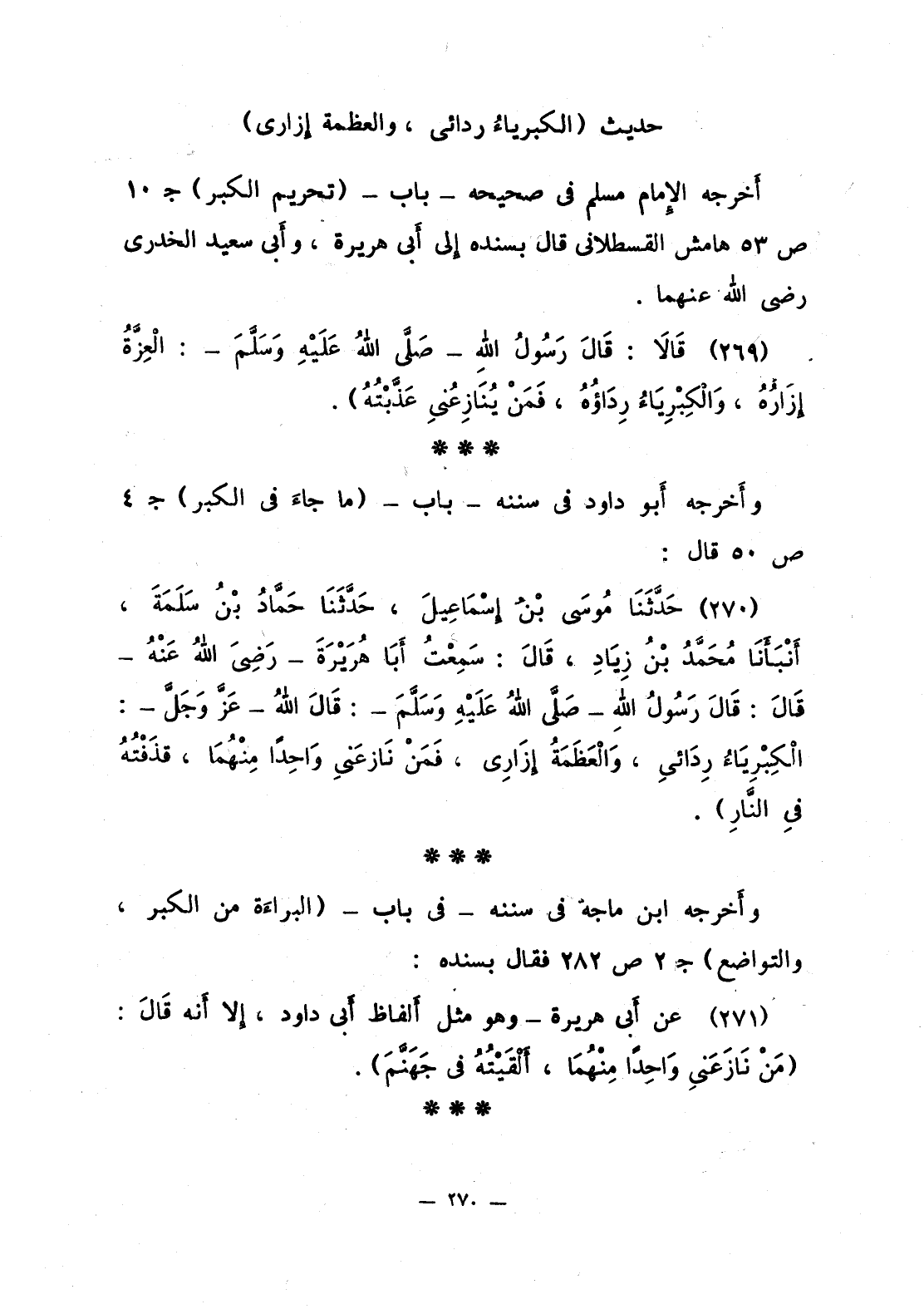 270 - قَالاَ: قَالَ رَسُولُ اللَّهِ صلى الله عليه وسلّم: «الْعِزَّةُ إزَارُهُ، والْكِبْرِيَاءُ رِدَاوُهُ، فَمَنْ يُنَازِعُني عَذَّبْتُهُ».