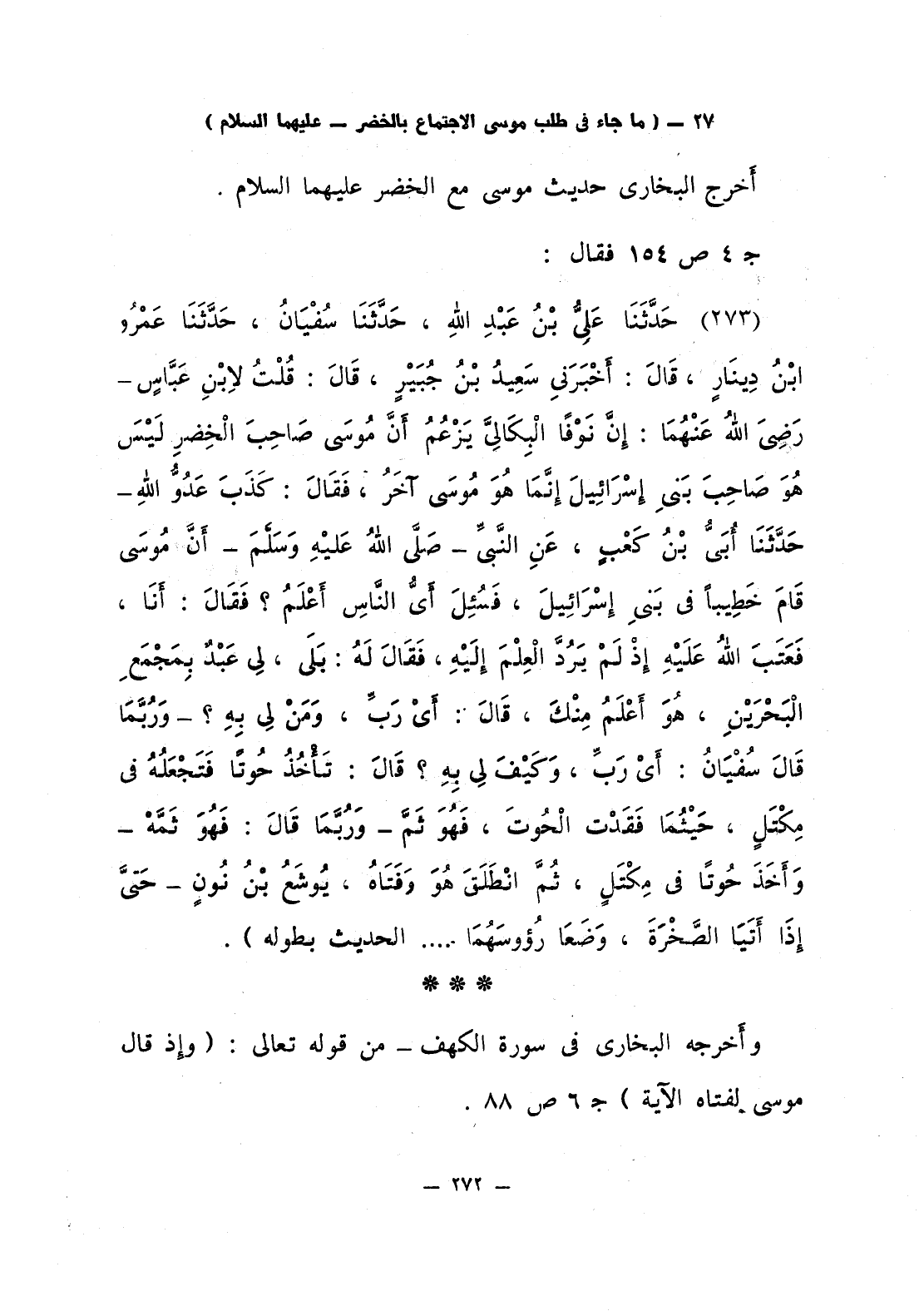 أخرج البخاري حديث موسى مع الخضر عليهما السلام ج - 4 ص 154 فقال: