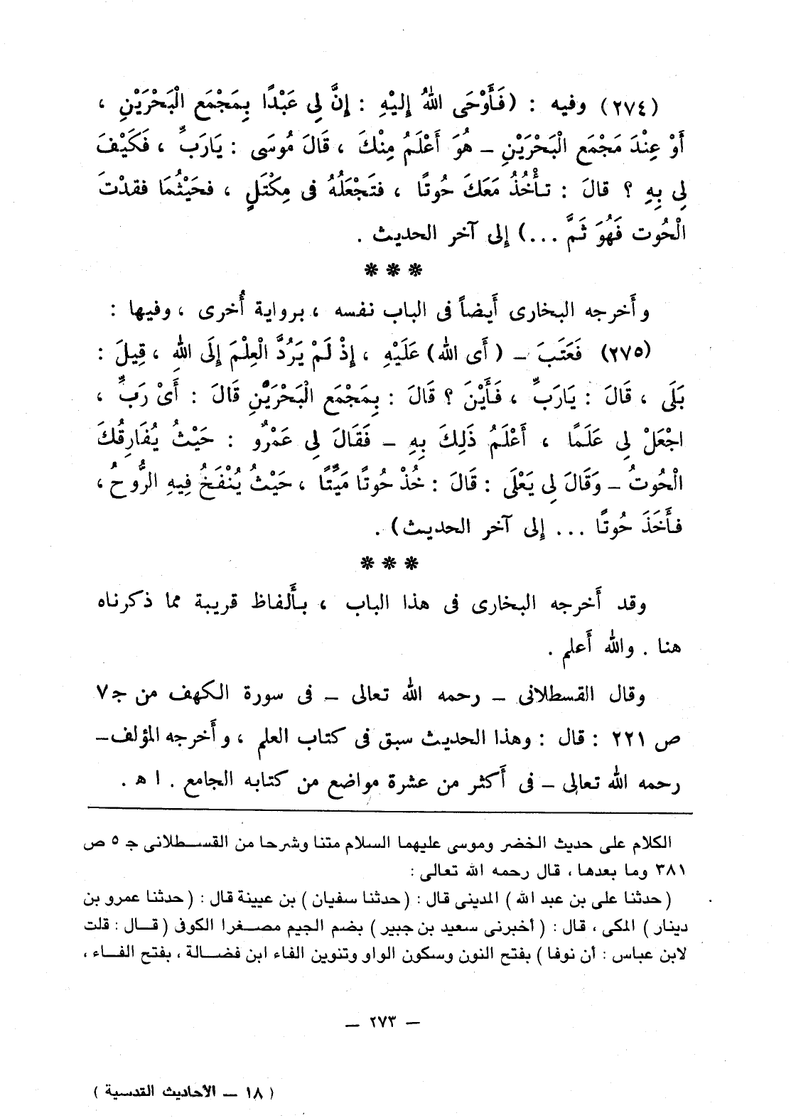 276 - فَعَتَبَ - (أي الله) عَلَيْهِ، إذْ لَمْ يَرُدُّ الْعِلْمَ إلَى اللَّهِ، قِيلَ: بَلَى، قَالَ: يَا رَبِّ، فَأَيْنَ؟ قَالَ: بِمَجْمع الْبَحْرَيْنِ قَالَ: أَيْ رَبِّ، اجْعَلْ لي عَلَما، أَعْلَمُ ذَلِكَ بِهِ» - فَقالَ لي عَمْرٌو: حَيْثُ يُفَارِقُكَ الْحُوتُ - وقَالَ لي يَعْلَى: قَالَ: «خُذْ حُوتا مَيِّتا، حَيْثُ يُنْفَخُ فِيهِ الرُّوحُ، فأَخَذَ حُوتا ... » إلى آخر الحديث.