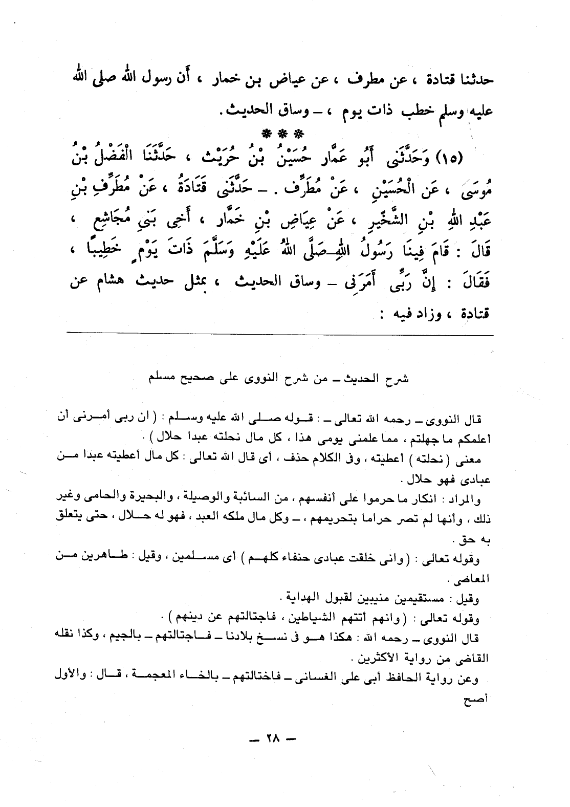 15 - وَحَدَّثَنِي أَبُو عَمَّار حُسَيْنُ بْنُ حُرَيْث، حَدَّثَنَا الْفَضْلُ بْنُ مُوسَى، عَن الْحُسَيْنِ، عَنْ مُطَرِّف. - حَدَّثَني قَتَادَةُ، عَنْ مُطَرِّفِ بْنِ عَبْدِ اللَّهِ بْنِ الشَّخِّيرِ عَنْ عِيَاضِ بْنِ خَمَّار، أَخِي بَنِي مُجَاشِعٍ، قَالَ: قَامَ فِينَا رَسُولُ اللَّهِ صلى الله عليه وسلّم ذَاتَ يَوْمٍ خَطِيبا، فقَالَ: إنَّ رَبِّي أَمَرَنِي - وساق الحديث، بمثل حديث هشام عن قتادة، وزاد فيه: