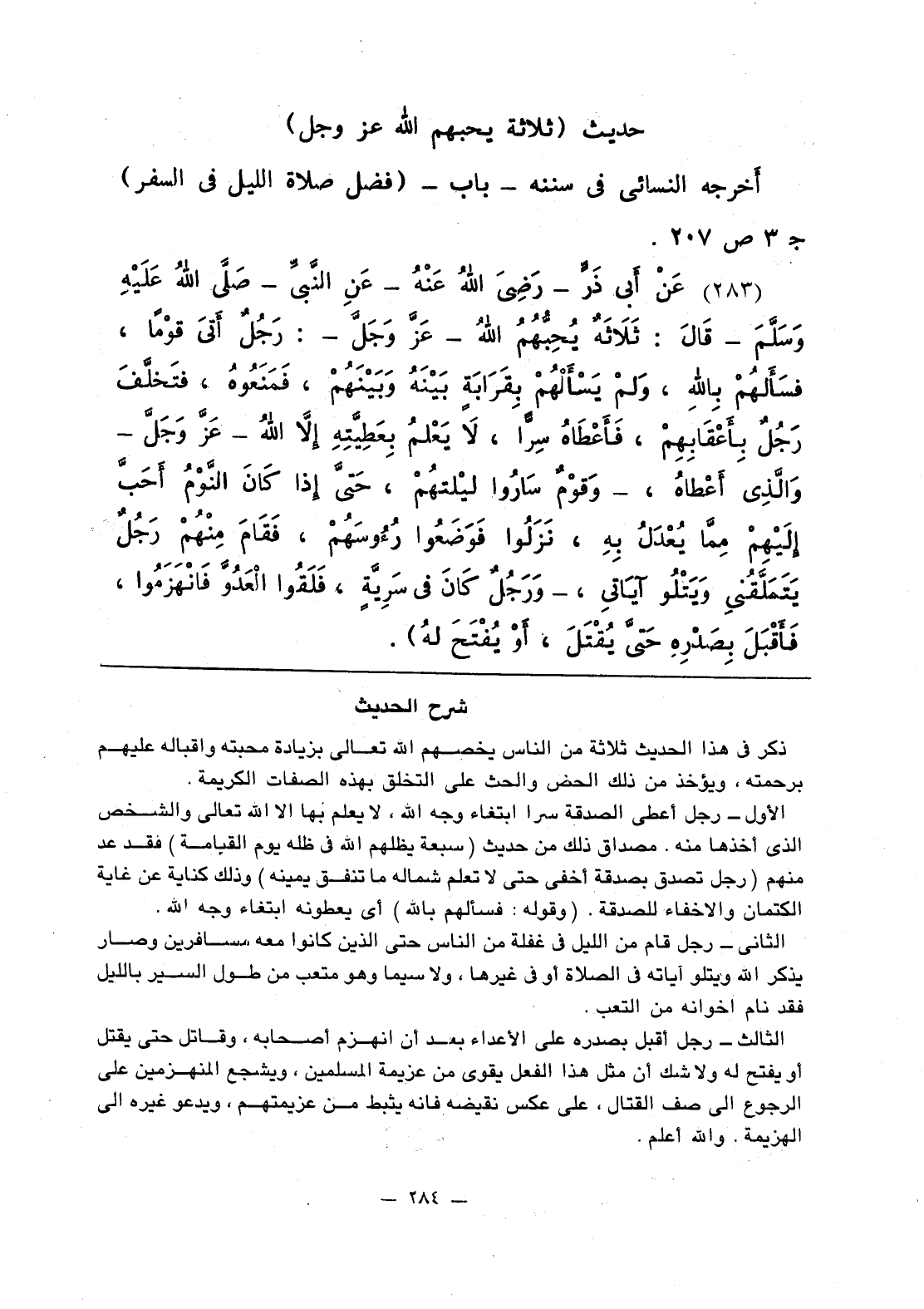 284 - عَنْ أَبي ذَرٍّ - رَضِيَ اللَّهُ عَنْهُ - عَنِ النَّبيِّ قَالَ: «ثَلاَثَةٌ يُحِبُّهُمُ اللَّهُ - عَزَّ وَجَلَّ - رَجُلٌ أَتَى قَوْما، فسَأَلَهُمْ بِاللَّهِ، ولَمْ يَسْأَلْهُمْ بِقَرَابَةٍ بَيْنَهُ وَبَيْنَهُمْ، فَمَنَعُوهُ، فتَخَلَّفَ رَجُلٌ بِأَعْقَابِهِمْ، فَأَعْطَاهُ سِرًّا، لاَ يَعْلَمُ بِعَطِيَّتِهِ إلاَّ اللَّهُ - عَزَّ وَجَلَّ - وَالَّذِي أَعْطاهُ، - وقَوْمٌ سَارُوا ليْلَتهُمْ، حَتَّى إذا كَانَ النَّوْمُ أَحَبَّ إلَيْهِمْ مِمَّا يُعْدَلُ بِهِ، نَزَلُوا فَوَضَعُوا رُوُوسَهُمْ، فَقَامَ مِنْهُمْ رَجُلٌ يَتَمَلَّقُني وَيَتْلُو آيَاتِي، - ورَجُلٌ كانَ في سَرِيَّةٍ، فَلَقُوا الْعَدُوَّ فَانْهَزَمُوا، فَأَقْبَلَ بَصَدْرِهِ حَتَّى يُقْتَلَ، أَوْ يُفْتَحَ لَهُ».