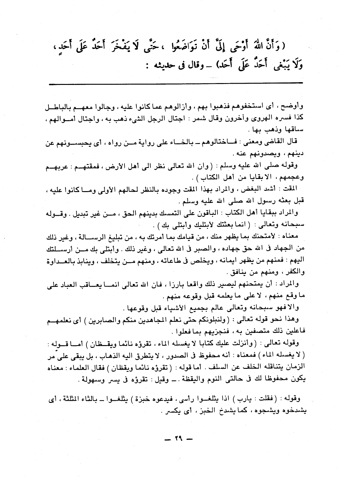 «وَأَنَّ اللَّهَ أَوْحَى إلَيَّ أَنْ تَوَاضَعُوا، حَتَّى لاَ يَفْخَرَ أَحَدٌ عَلَى أَحَدٍ، وَلاَ يَبْغِي أَحَدٌ عَلَى أَحَد» - وقال في حديثه: