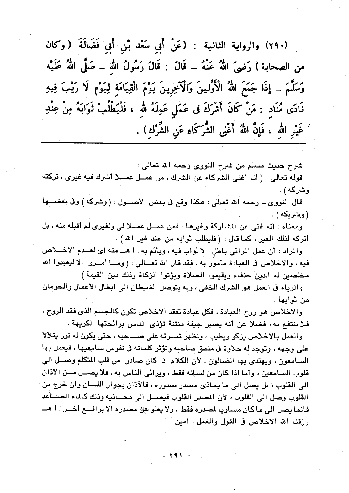 291 - والرواية الثانية: عَنْ أَبي سَعْد بْنِ أَبي فَضَالَةَ (وكان من الصحابة) رَضِيَ اللَّهُ عَنْهُ - قَالَ: قالَ رَسُولُ اللَّهِ صلى الله عليه وسلّم: «إذَا جَمَعَ اللَّهُ الأَوَّلِينَ والآخَرِينَ يَوْمَ الْقِيَامَةِ لِيَوْمٍ لاَ رَيْبَ فِيهِ نَادَى مُنَادٍ: مَنْ كانَ أَشْرَكَ في عَمَلٍ عَمِلَهُ للَّهِ، فَلْيَطْلُبْ ثَوَابَهُ مِنْ عِنْدِ غَيْرِ اللَّهِ، فَإنَّ اللَّهَ أَغْنى الشُّرَكَاءِ عَنِ الشِّرْكِ».