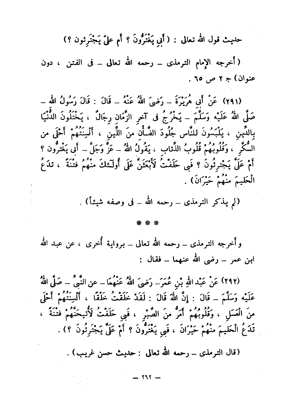 292 - عَنْ أَبي هُرَيْرَةَ - رَضِيَ اللَّهُ عَنْهُ - قَالَ: قَالَ رَسُولُ اللَّهِ صلى الله عليه وسلّم: «يَخْرُجُ في آخرِ الزَّمانِ رِجالٌ، يَخْتَلُونَ الدُّنْيَا بِالدِّينِ، يَلْبَسُونَ للنَّاسِ جُلُودَ الضَّأْنِ مِنَ اللِّينِ، أَلْسِنَتُهُمْ أَحْلَى من السُّكَّرِ، وقُلُوبُهُمْ قُلُوبُ الذِّئابِ، يَقُولُ اللَّهُ - عَزَّ وَجَلَّ - أَبي يَغْترُّون؟ أَمْ عَلَيَّ يَجْتَرِئُونَ؟ فَبي حَلَفْتُ لأَبْعَثَنَّ عَلَى أُولئِكَ منْهُمُ فِتْنَةً، تدَع الْحَلِيمَ منْهُمْ حَيْرَانَ».