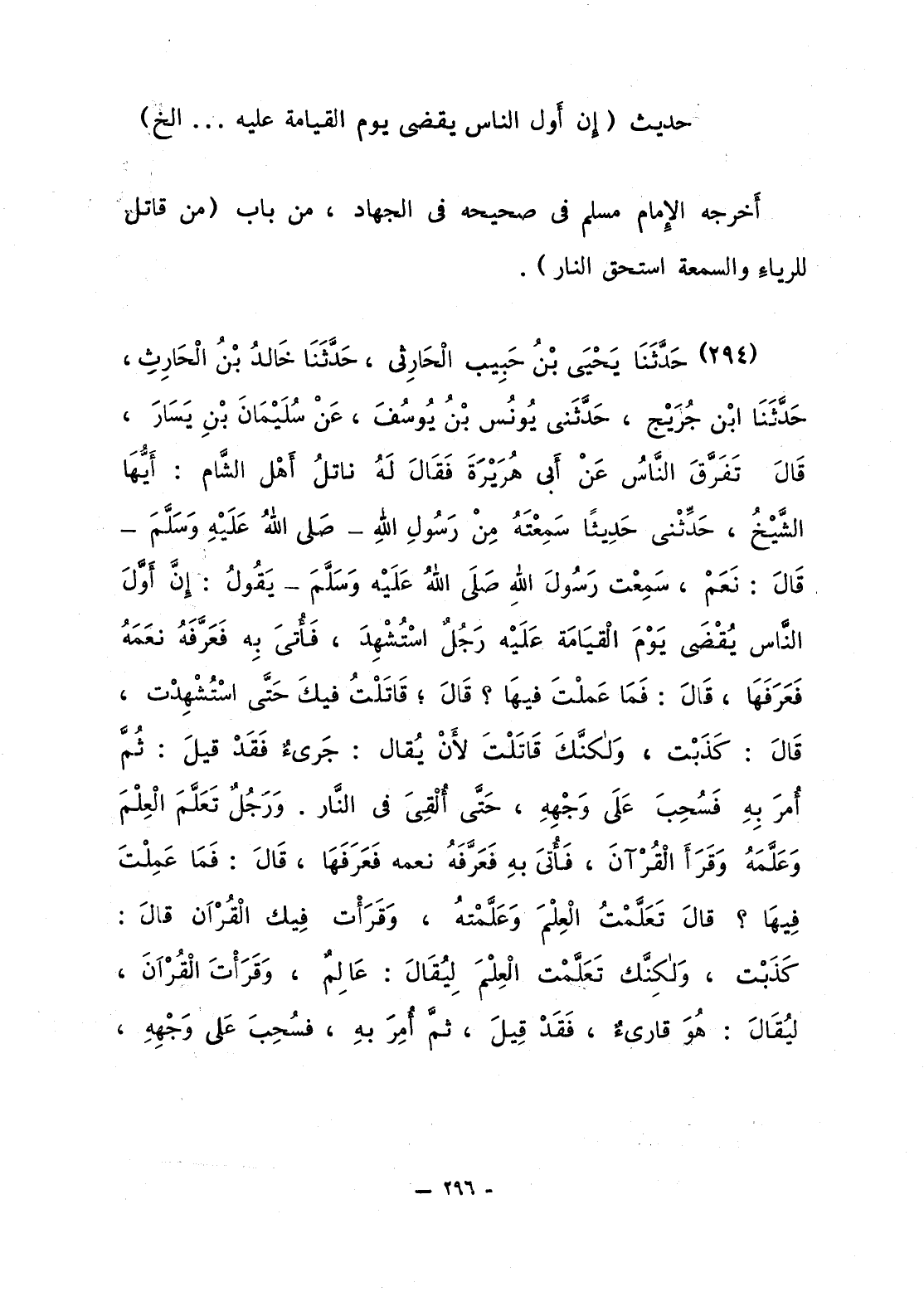295 - حَدَّثَنَا يَحْيَى بْنُ حَبِيب الْحَارِثي، حَدَّثَنَا خَالدُ بْنُ الْحَارِثِ، حَدَّثَنَا ابْن جُرَيْج، حَدَّثَني يُونُس بْنُ يُوسُفَ، عَنْ سُلَيْمَانَ بْنِ يَسَار، قَالَ: تَفَرَّقَ النَّاسُ عَنْ أَبي هُرَيْرَةَ فَقالَ لَهُ ناتِلُ أَهْل الشَّام: أَيُّهَا الشَّيْخُ، حَدِّثْني حَدِيثا سَمِعْتَهُ مِنْ رَسُولِ اللَّهِ. قَالَ: نَعَمْ، سَمِعْتُ رَسُولَ اللَّهِ يَقُولُ: «إنَّ أَوَّلَ النَّاس يُقْضَى يَوْمَ الْقِيامةِ عَلَيْه رَجلٌ اسْتُشْهِدَ، فَأُتِيَ بِهِ فَعَرَّفَهُ نعَمَهُ فَعَرَفَها، قَالَ: فَمَا عَملْتَ فيهَا؟ قَالَ: قَاتَلْتُ فيكَ حَتَّى اسْتُشْهِدْت، قَالَ: كَذَبْت، وَلكِنَّك قَاتَلْتَ لأَن يُقال: جَريءٌ فَقَدْ قيلَ؛ ثُم أُمِرَ بِه فَسُحِبَ عَلى وَجْهِهِ، حَتَّى أُلْقِيَ في النارِ. وَرَجُلٌ تَعَلَّمَ الْعِلْمَ وعَلَّمَهُ وَقَرَأَ الْقُرْآنَ، فَأُتيَ بهِ فَعَرَّفَهُ نعمه فَعَرَفَها، قَالَ: فَمَا عَمِلْتَ فِيهَا؟ قَالَ: تَعَلَّمْتُ الْعِلْمَ وعَلَّمْتهُ، وَقَرَأْت فِيك الْقُرْآن. قَالَ: كَذَبْت، وَلكِنَّك تَعَلَّمْتَ الْعِلْمَ لِيُقَالَ: عالِمٌ، وقَرَأْتَ الْقُرآنَ، ليُقالَ: هُوَ قارىءٌ، فَقَدْ قِيلَ، ثمَّ أُمِرَ بهِ، فسُحِبَ علَى وَجْهِهِ،