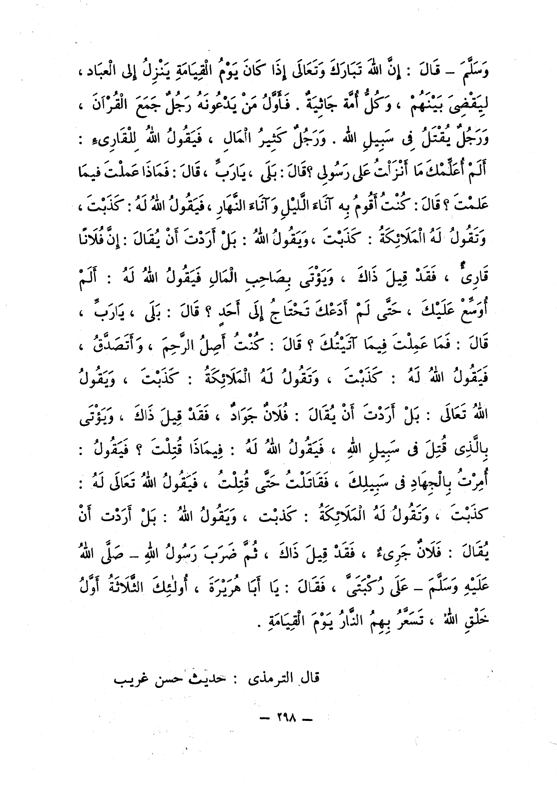 قَالَ: «إنَّ اللَّهَ تَبَارَكَ وَتَعَالَى إذَا كَانَ يَوْمُ الْقِيَامَةِ يَنْزِلُ إلى الْعِبَاد، لِيَقْضِيَ بَيْنَهُمْ، وَكُلُّ أُمَّة جَاثِيَةٌ. فَأَوَّلُ مَنْ يَدْعُونَهُ رَجُلٌ جَمَعَ الْقُرْآنَ، ورَجُلٌ يُقْتَلُ في سَبيلِ الله. ورَجُلٌ كَثِيرُ الْمالِ، فَيَقُولُ اللَّهُ لِلْقِارِىءِ: أَلَمْ أُعَلِّمْكَ مَا أَنْزَلْتُ عَلى رَسُولي؟ قَالَ: بَلَى، يَا رَبِّ، قَالَ: فَمَاذَا عَملْتَ فيمَا عَلمْتَ؟ قَالَ: كُنْتُ أَقُومُ بهِ آنَاءَ اللَّيْلِ وآنَاءَ النَّهَارِ، فَيَقُولُ اللَّهُ لَهُ: كَذَبْتَ، وَتَقُولُ لَهُ الْمَلاَئِكَةُ: كَذَبْتَ، وَيَقُولُ اللَّهُ: بَلْ أَرَدْتَ أَنْ يُقَالَ: إنَّ فُلانا قَارِىءٌ، فقَدْ قِيلَ ذَاكَ، وَيوْتَى بِصَاحِبِ الْمَالِ فَيَقُولُ اللَّهُ له: أَلَمْ أُوَسِّعْ عَلَيْكَ، حَتَّى لَمْ أَدَعْكَ تَحْتَاجُ إلَى أَحَدٍ؟ قَالَ: بَلَى، يَا رَبِّ، قَالَ: فَمَا عَمِلْتَ فِيمَا آتَيْتُكَ؟ قَالَ: كُنْتُ أَصِلُ الرَّحِمَ، وَأَتَصَدَّقُ، فَيَقُولُ اللَّهُ لَهُ: كَذَبْتَ، وَتَقُولُ لَهُ الْمَلاَئِكَةُ: كَذَبْتَ، وَيَقُولُ اللَّهُ تَعَالَى: بَلْ أَرَدْتَ أَنْ يُقَالَ: فُلاَنٌ جَوَادٌ، فَقَدْ قِيلَ ذَاكَ، وَيُؤتَى بِالَّذي قُتِلَ في سَبِيلِ اللَّهِ، فَيَقُولُ اللَّهُ لَهُ: فِيمَاذَا قُتِلْتَ؟ فَيَقُولُ: أُمِرْتُ بِالْجِهَادِ في سَبِيلكَ، فقَاتَلْتُ حَتَّى قتِلْتُ، فَيَقُولُ اللَّهُ تَعالَى لَهُ: كَذَبْتَ، وَتقُولُ لَهُ الْملاَئِكَةُ: كَذبْت، ويَقُولُ اللَّهُ: بَلْ أَرَدْت أَنْ يُقالَ: فلاَنٌ جَرِيءٌ، فقَدْ قِيلَ ذَاكَ، ثُمَّ ضَرَبَ رَسُولُ اللَّهِ صلى الله عليه وسلّم عَلَى رُكْبَتيَّ، فَقَالَ: يَا أَبَا هُرَيْرَةَ، أُولئِكَ الثَّلاَثَةُ أَوَّلُ خَلْقِ اللَّهِ، تَسَعَّرُ بِهِمُ النارُ يَوْمَ الْقِيَامَةِ».