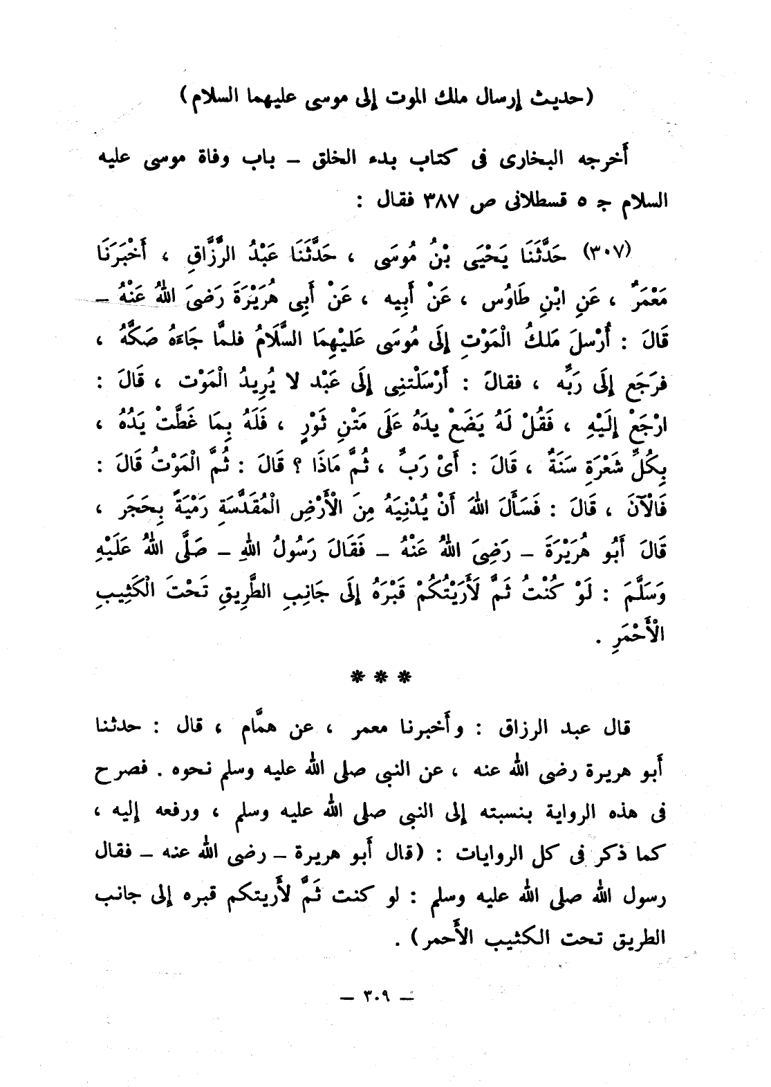 308 - حَدَّثَنَا يَحْيَى بْنُ مُوسَى، حَدَّثَنَا عبْدُ الرَّزَّاقِ، أَخْبَرَنَا مَعْمَرٌ، عَنِ ابْنِ طَاوُس، عَنْ أَبيه، عَن أَبي هُرَيْرَةَ رَضِيَ اللَّهُ عَنْهُ - قَالَ: أُرْسلَ مَلكُ الْمَوْتِ إلَى مُوسَى علَيْهِما السَّلاَمُ فلمَّا جاءَهُ صَكَّهُ، فرَجَع إلى رَبِّه، فقَالَ: أَرْسَلْتني إلَى عَبْد لا يُريدُ الْمَوْت، قَالَ: ارْجَعْ إلَيْهِ، فَقُلْ لَهُ يَضَعْ يَدَهُ عَلى مَتْنِ ثَوْرٍ، فَلَهُ بِما غَطَّتْ يَدُهُ، بِكُلِّ شَعْرَةِ سَنَةٌ، قَالَ: أَيْ رَبِّ، ثُمَّ ماذا؟ قَالَ: ثُمَّ الْمَوْتُ قَالَ: فَالآنَ، قَالَ: فَسَأَلَ اللَّهَ أَنْ يُدْنِيَهُ مِنَ الأَرْضِ المُقَدَّسَةِ رَمْيَةً بِحَجَر، قالَ أَبُو هرَيْرَةَ - رَضِيَ اللَّهُ عَنْهُ - فقالَ رَسُولُ اللَّهِ صلى الله عليه وسلّم: «لَوْ كُنْتُ ثَمَّ لأَرَيْتُكُمْ قَبْرَهُ إلى جَانِبِ الطَّرِيقِ تَحتَ الْكَثِيبِ الأحْمَرِ».